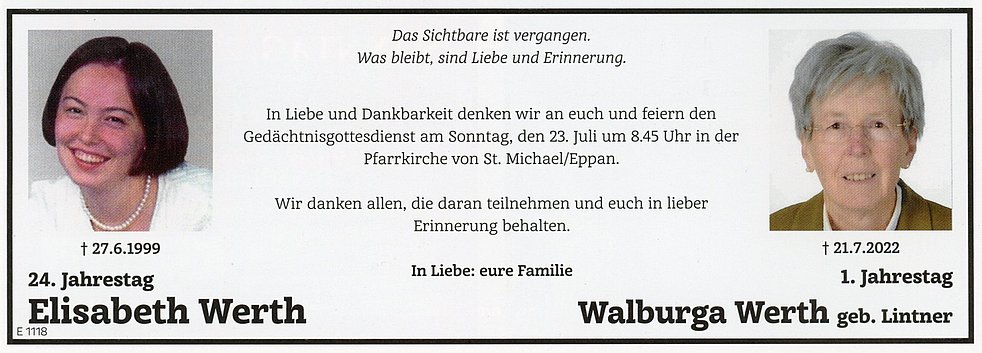 Den Abschiedsgottesdienst feiern wir am Dienstag, dem 26. Juli um 16 Uhr in der Pfarrkirche von St. Michael/Eppan, anschließend begleiten wir unsere liebe Burgi zum Ortsfriedhof.