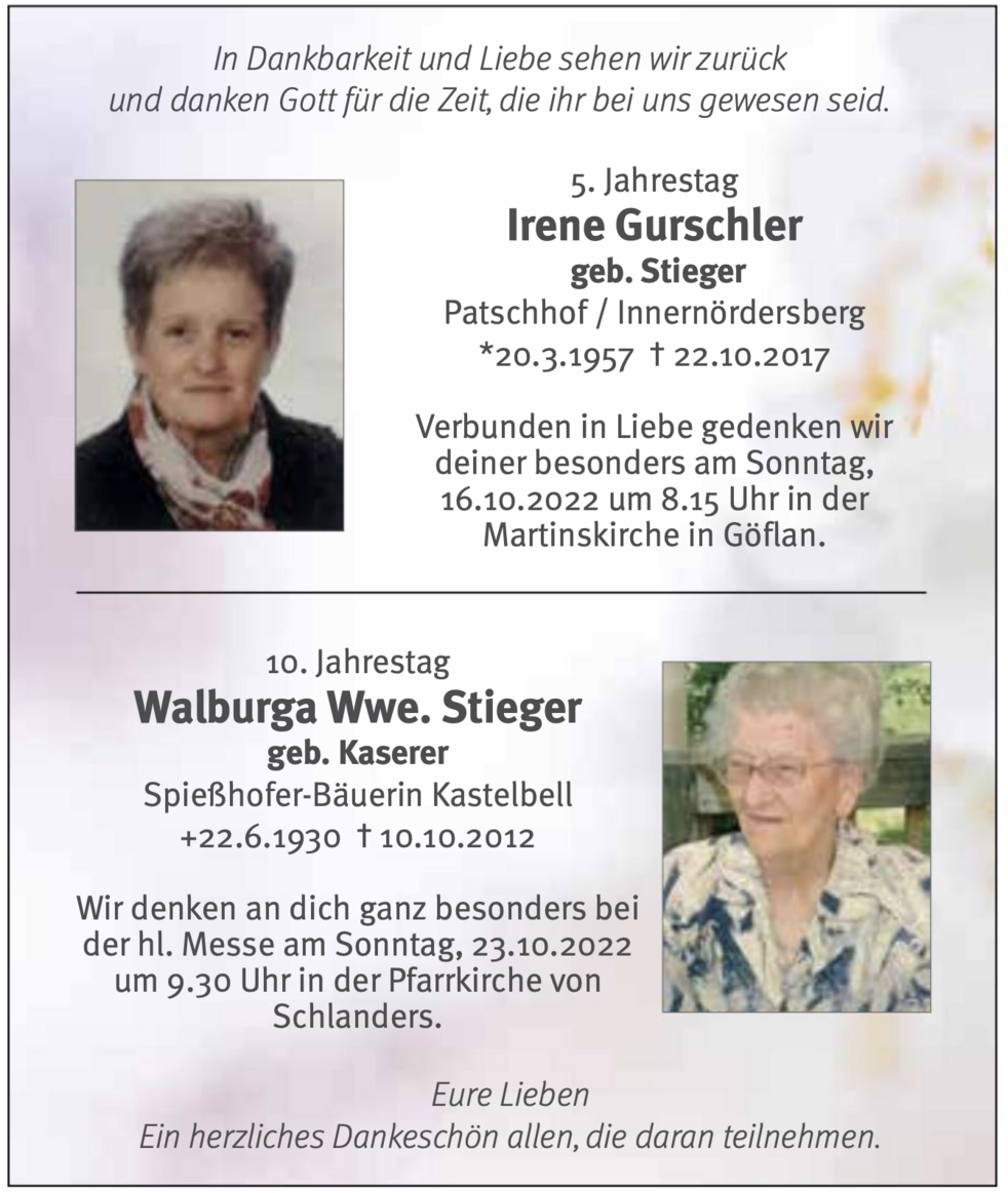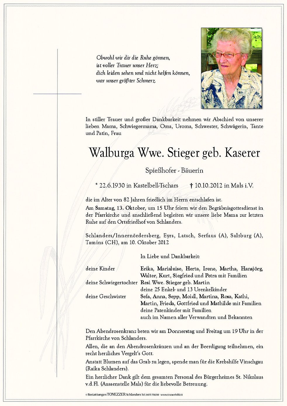 Am Samstag, 13. Oktober, um 15 Uhr feiern wir den Begräbnisgottesdienst in der Pfarrkirche und anschließend begleiten wir unsere liebe Mama zur letzten Ruhe auf den Ortsfriedhof von Schlanders.