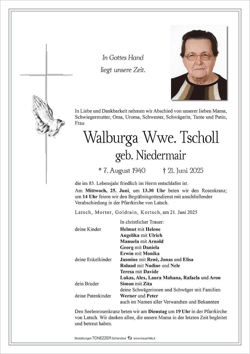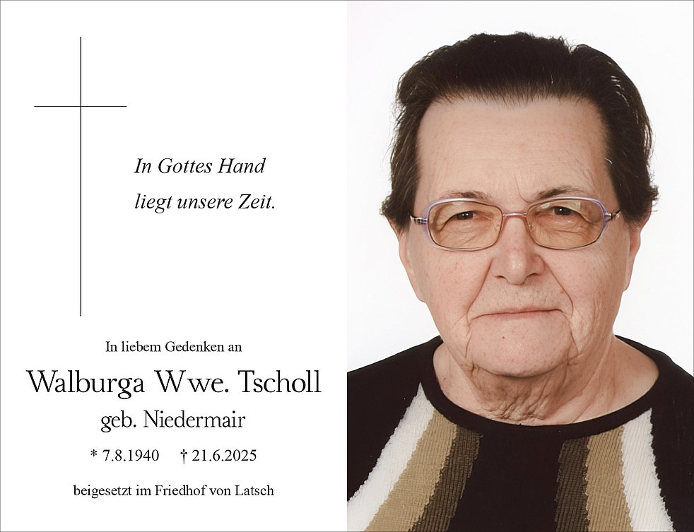 Ruhe in Frieden Burgl, das ewige Licht des erschienen Herren möge dich sicher auf die andere Seite des Lebens begleiten und die Schmerzhafte Mutter zur Latscher Brücke, welche du sehr verehrt hast, deine Fürsprecherin.