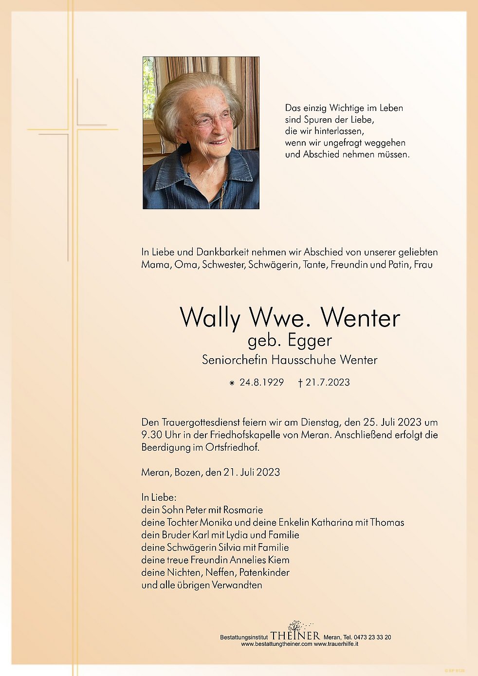 Den Trauergottesdienst feiern wir am Dienstag, den 25. Juli 2023 um 9.30 Uhr in der Friedhofskapelle von Meran. Anschließend erfolgt die Beerdigung im Ortsfriedhof.
