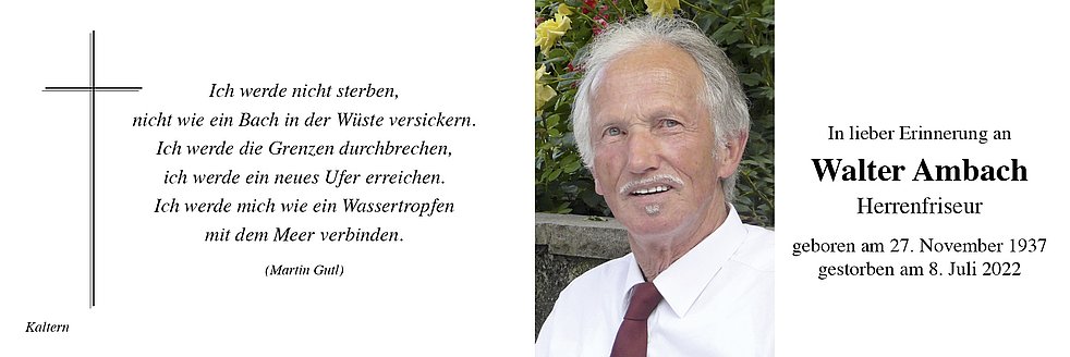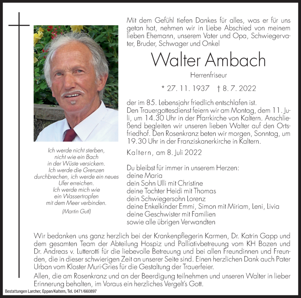 Den Trauergottesdienst feiern wir am Montag, den 11. Juli um 14.30 Uhr in der Pfarrkirche von Kaltern. Anschließend begleiten wir unseren lieben Walter auf den Ortsfriedhof.