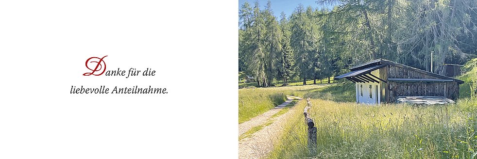 Wir bedanken uns ganz herzlich bei der Krankenpflegerin Karmen, Dr. Katrin Gapp und dem gesamten Team der Abteilung Hospice und Palliativbetreuung vom KH Bozen und Dr. Andreas v. Lutterotti für die liebevolle Betreuung und bei allen Freundinnen und Freunden, die in dieser schwierigen Zeit an unserer Seite sind. Herzlichen Dank auch an Pater Urban vom Kloster Muri-Gries für die Gestaltung der Trauerfeier.