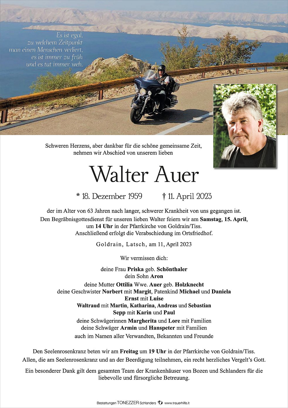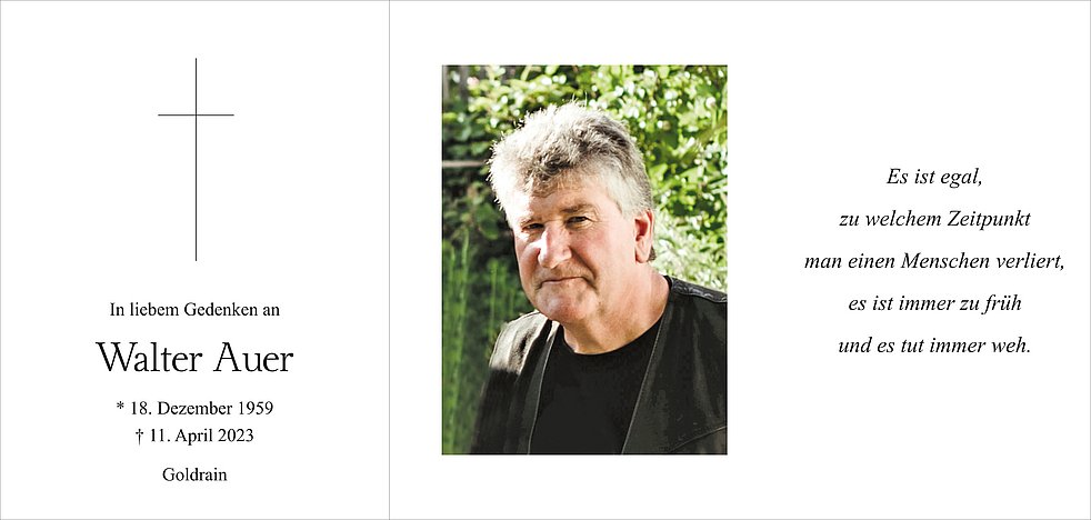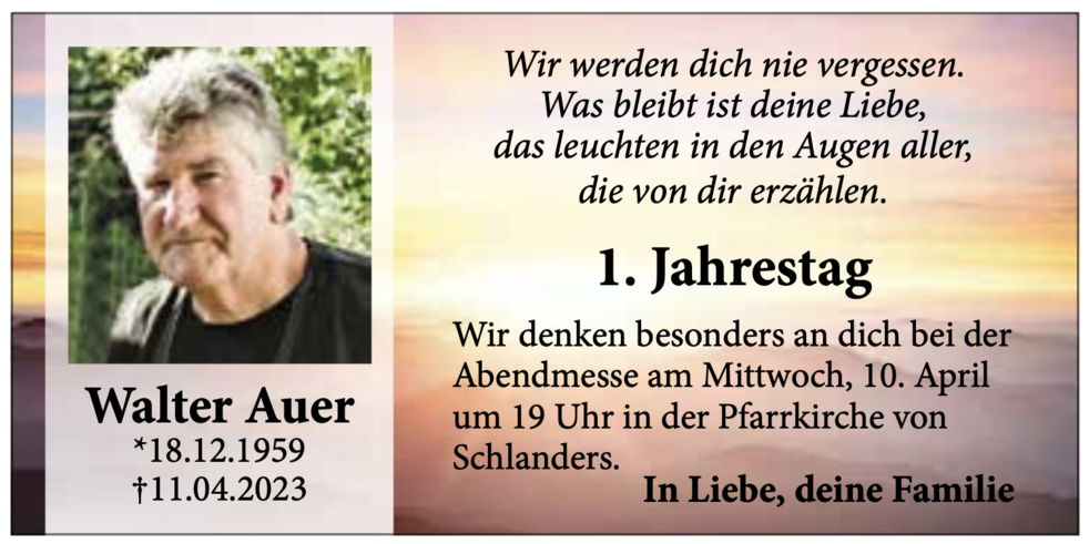Den Begräbnisgottesdienst für unseren lieben Walter feiern wir am Samstag, 15. April, um 14 Uhr in der Pfarrkirche von Goldrain/Tiss.