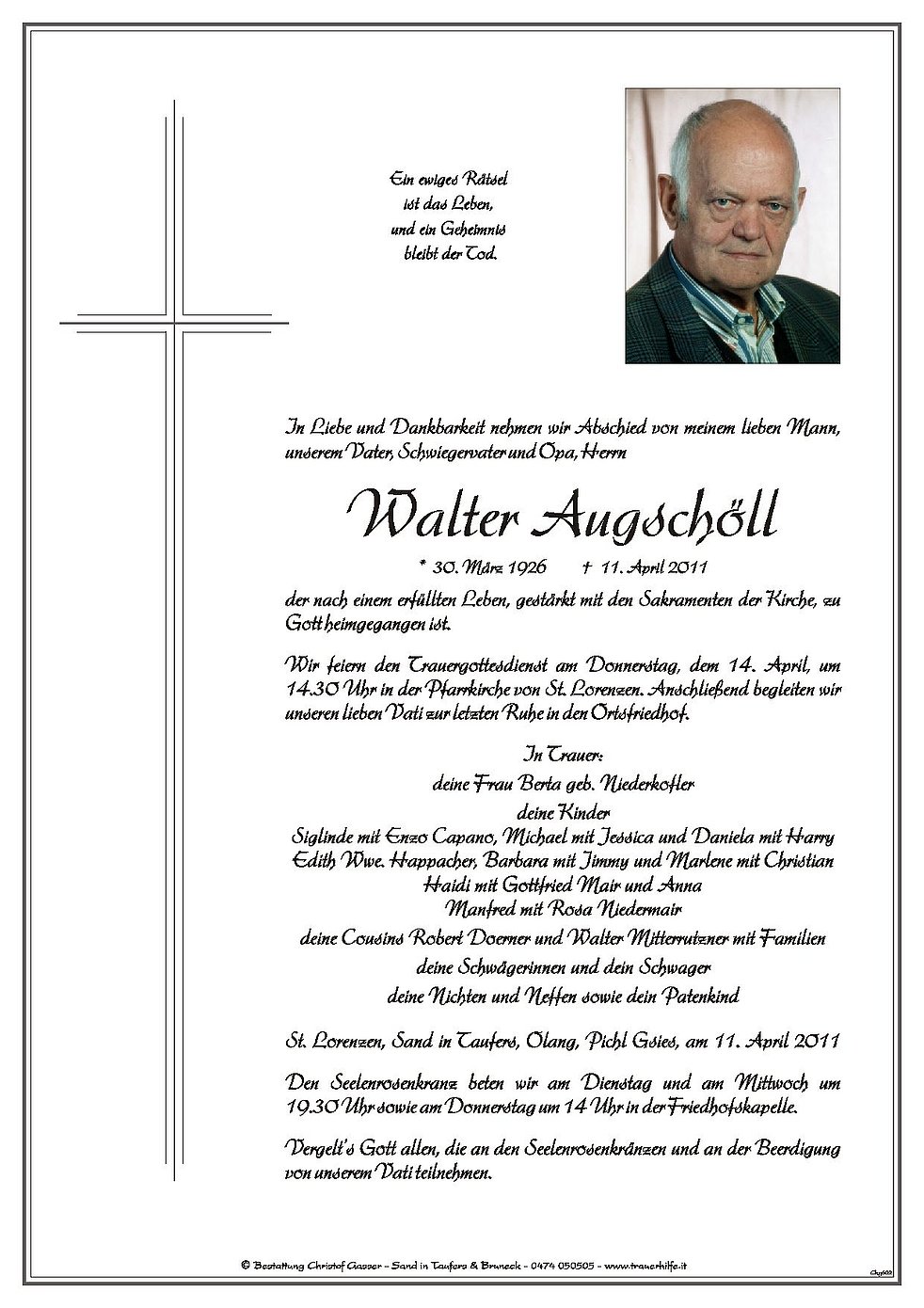 Wir feiern den Trauergottesdienst am Donnerstag, dem 14. April, um 14.30 Uhr in der Pfarrkirche von St. Lorenzen. Anschließend begleiten wir unseren lieben Vati zur letzten Ruhe in den Ortsfriedhof.