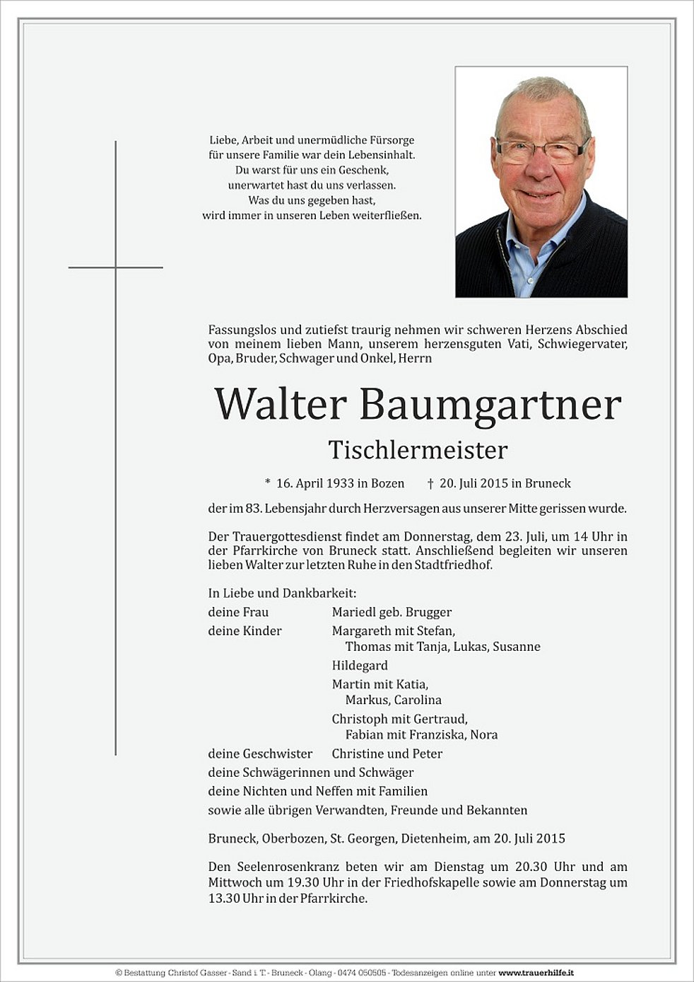 Der Trauergottesdienst findet am Donnerstag, dem 23. Juli, um 14 Uhr in der Pfarrkirche von Bruneck statt. Anschließend begleiten wir unseren lieben Walter zur letzten Ruhe in den Stadtfriedhof.