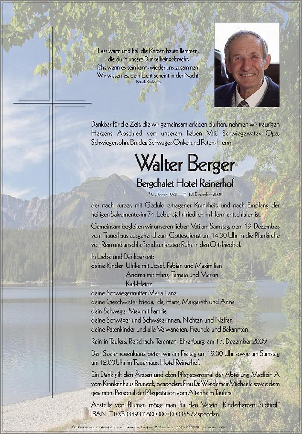 Gemeinsam begleiten wir unseren lieben Vati am Samstag, dem 19. Dezember, vom Trauerhaus ausgehend zum Gottesdienst um 14.30 Uhr in die Pfarrkirche von Rein und anschließend zur letzten Ruhe in den Ortsfriedhof.