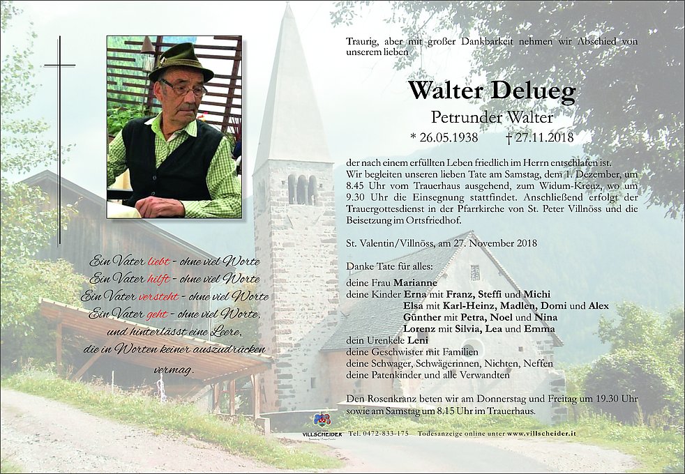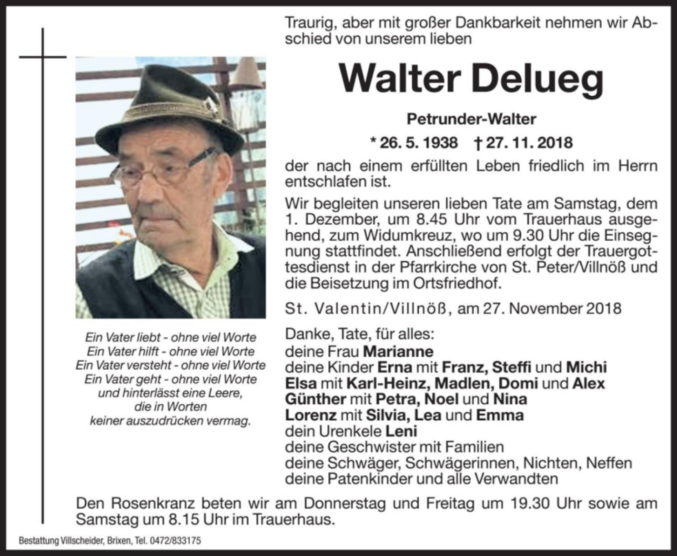 Liebe Erna, liebe Elsa. Wir wuenschen Euch in dieser schwierigen Zeit Trost und Hoffnung aus den gluecklichen Stunden, die ihr gemeinsam mit Eurem Vater erleben durftet. Herzliches Beileid. Elke, Birgit und Anni Erlacher