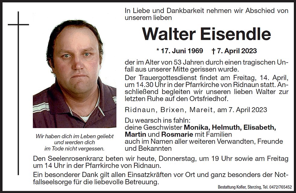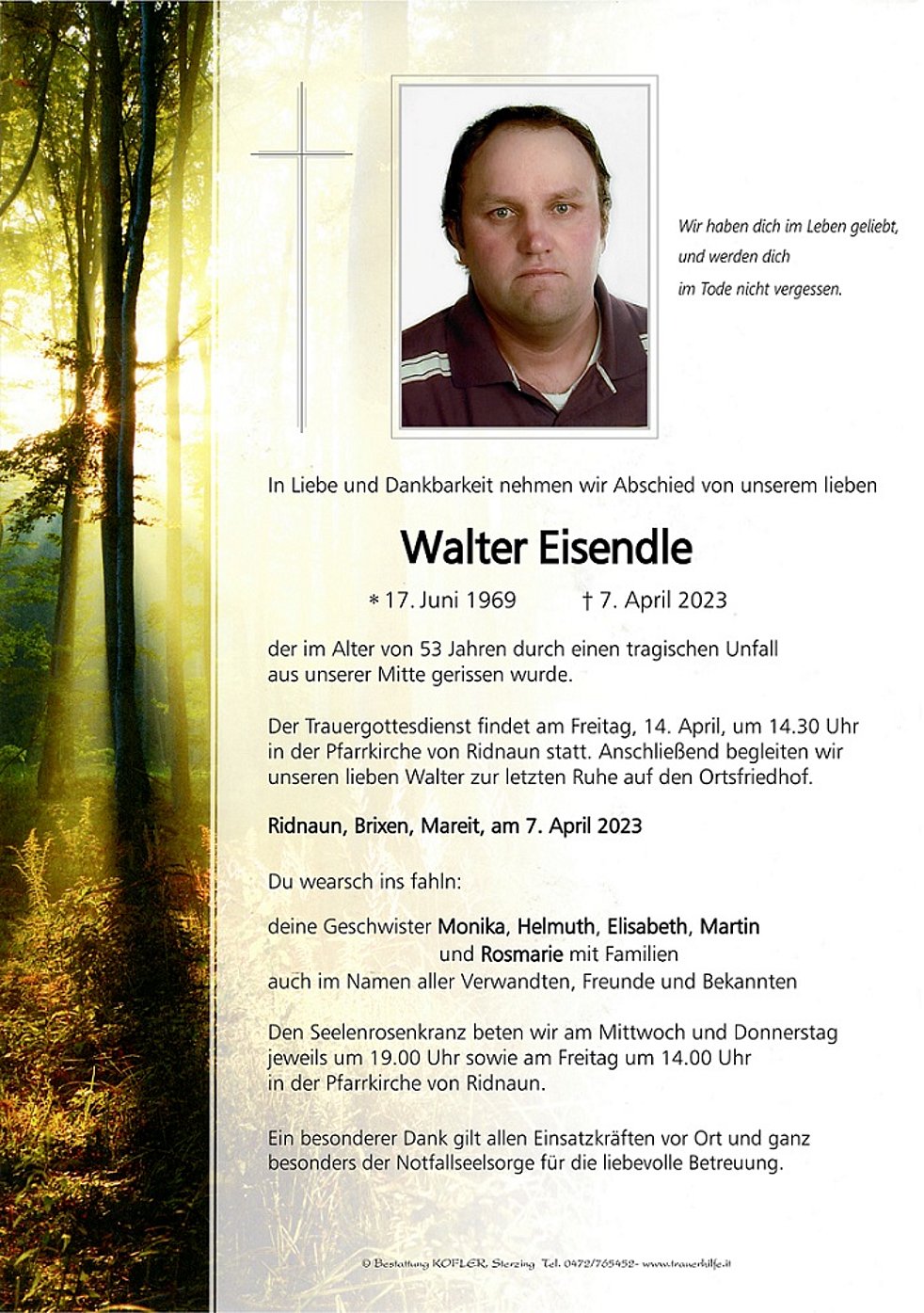 Der Trauergottesdienst findet am Freitag, 14. April, um 14.30 Uhr in der Pfarrkirche von Ridnaun statt. Anschließend begleiten wir unseren lieben Walter zur letzten Ruhe auf den Ortsfriedhof.