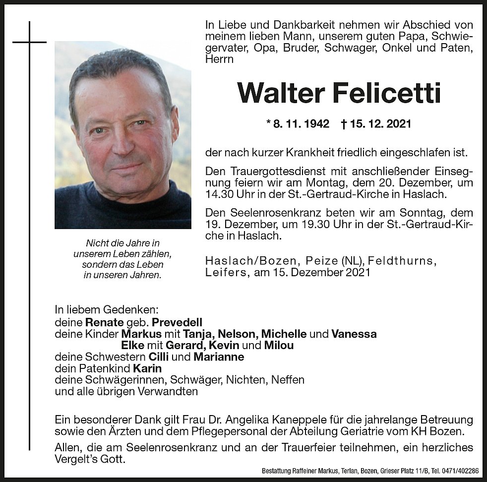 Haslach/Bozen, Peize (NL), Felthurns, Leifers, am 15. Dezember 2021
