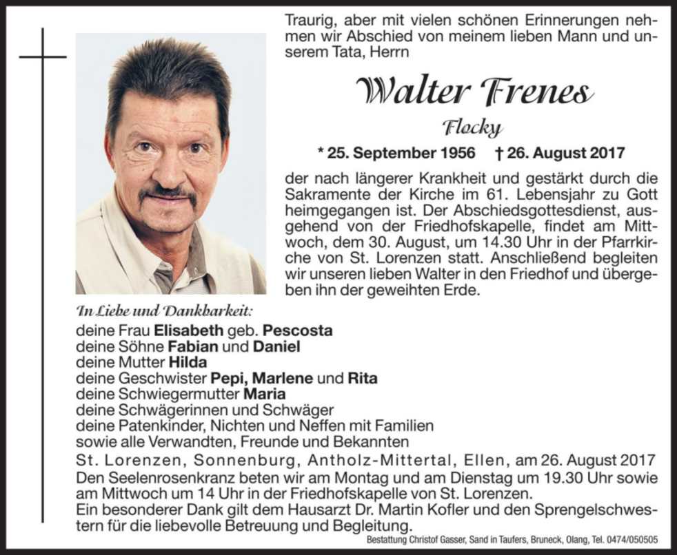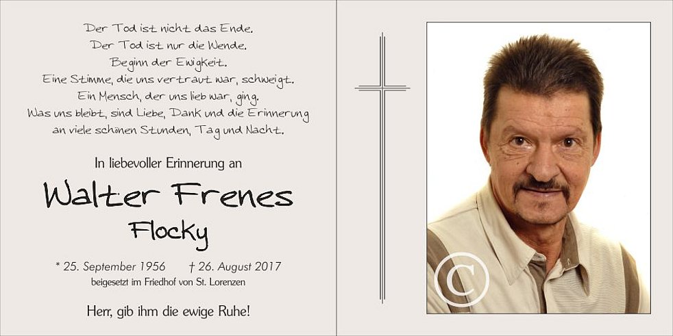 St. Lorenzen statt. Anschließend begleiten wir unseren lieben Walter in den Friedhof und übergeben ihn der geweihten Erde.
