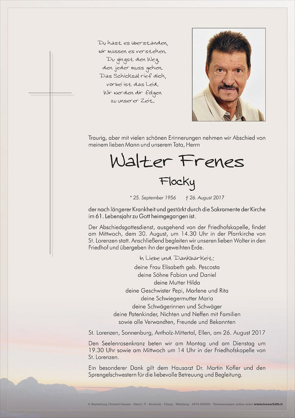 Ein besonderer Dank gilt dem Hausarzt Dr. Martin Kofler und den Sprengelschwestern für die liebevolle Betreuung und Begleitung.