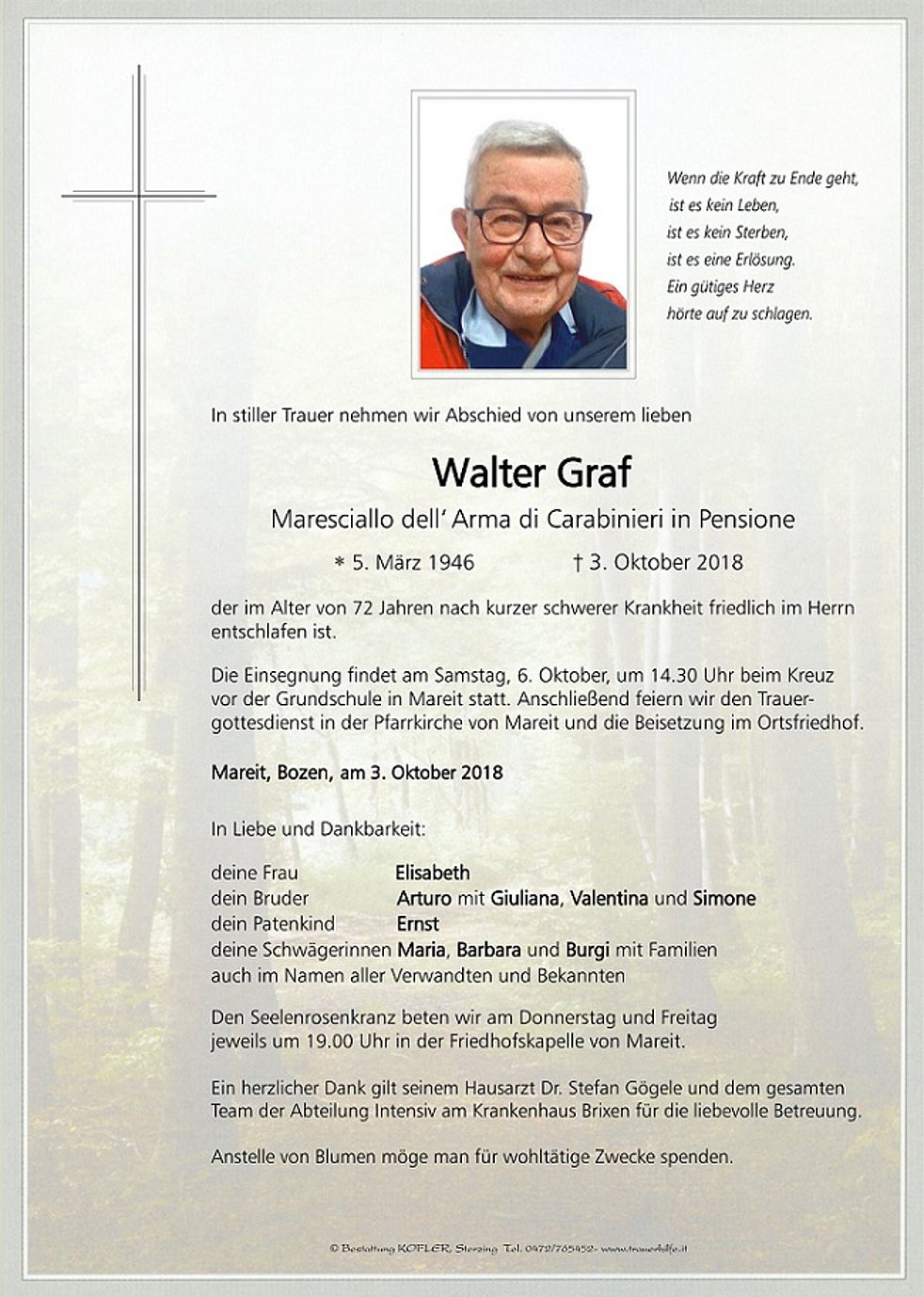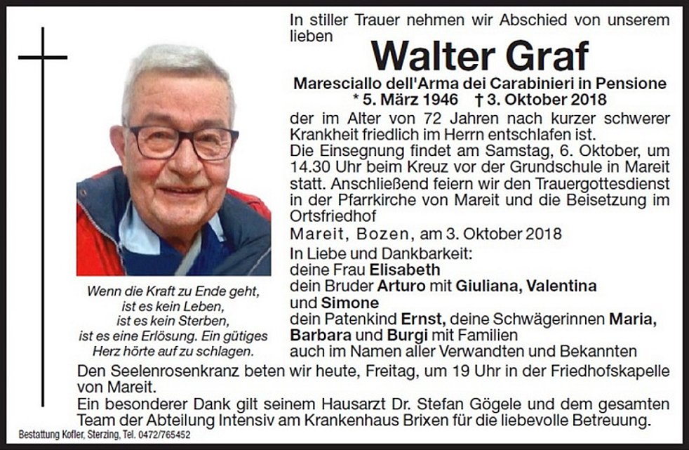 Die Einsegnung findet am Samstag, 6. Oktober, um 14.30 Uhr beim Kreuz vor der Grundschule in Mareit statt. Anschließend feiern wir den Trauergottesdienst in der Pfarrkirche von Mareit und die Beisetzung im Ortsfriedhof.