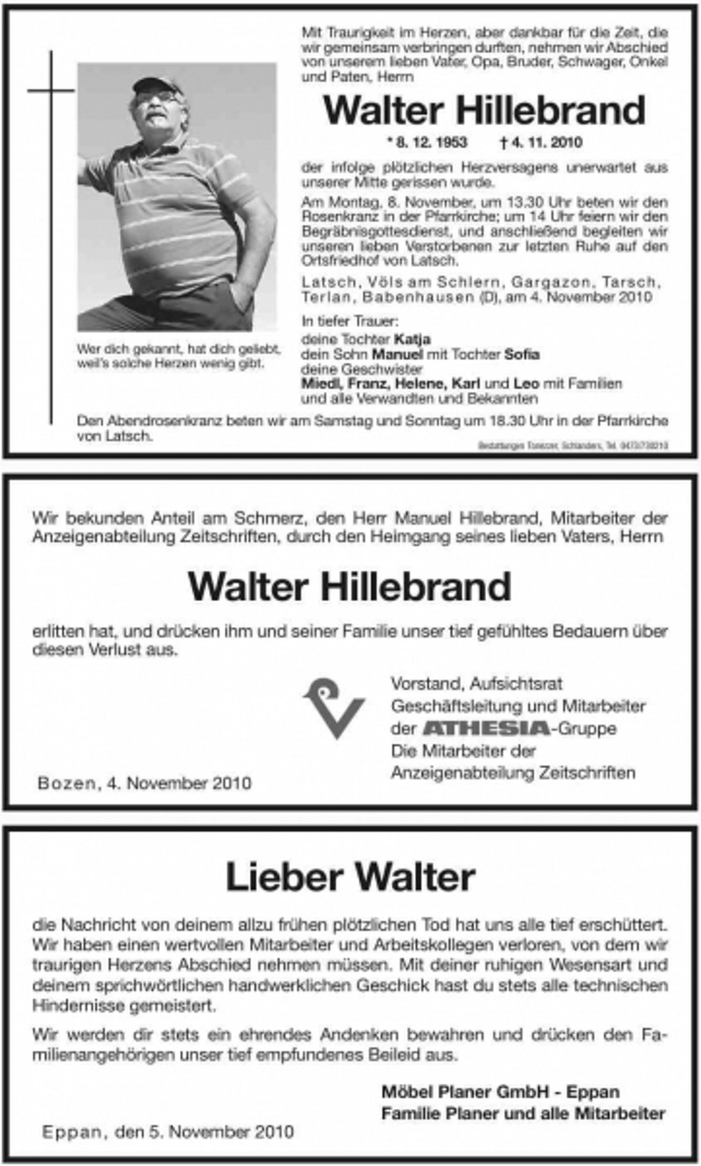 Am Montag, 8. November, um 13.30 Uhr beten wir den Rosenkranz in der Pfarrkirche; um 14 Uhr feiern wir den Begräbnisgottesdienst und anschließend begleiten wir unseren lieben Verstorbenen zur letzten Ruhe auf den Ortsfriedhof von Latsch.
