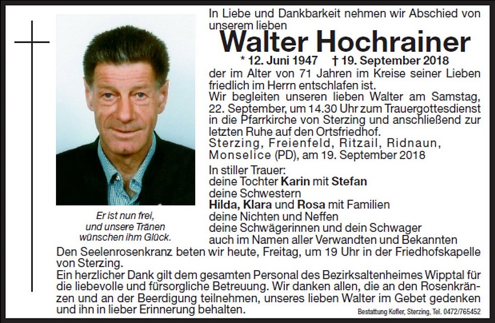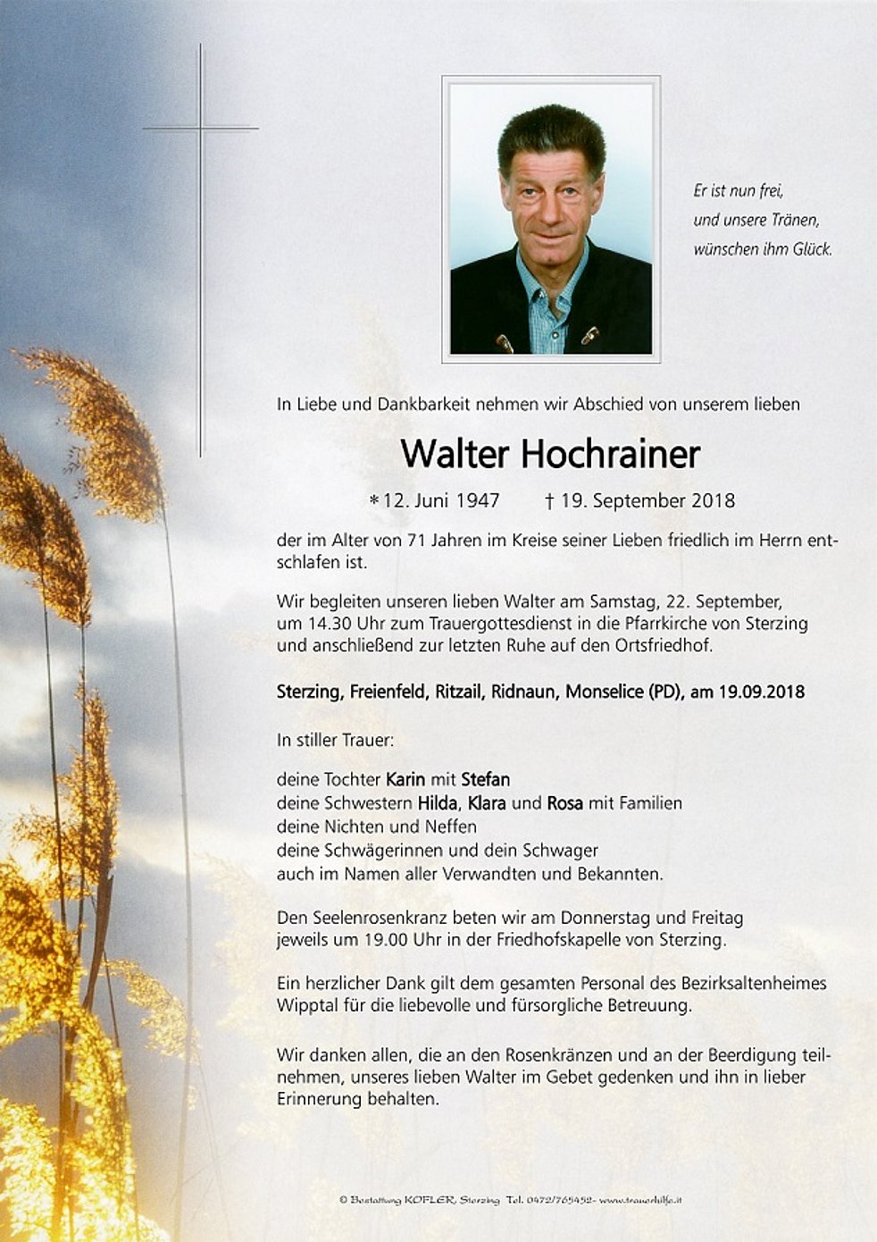 Wir begleiten unseren lieben Walter am Samstag, 22. September, um 14.30 Uhr zum Trauergottesdienst in die Pfarrkirche von Sterzing und anschließend zur letzten Ruhe auf den Ortsfriedhof.