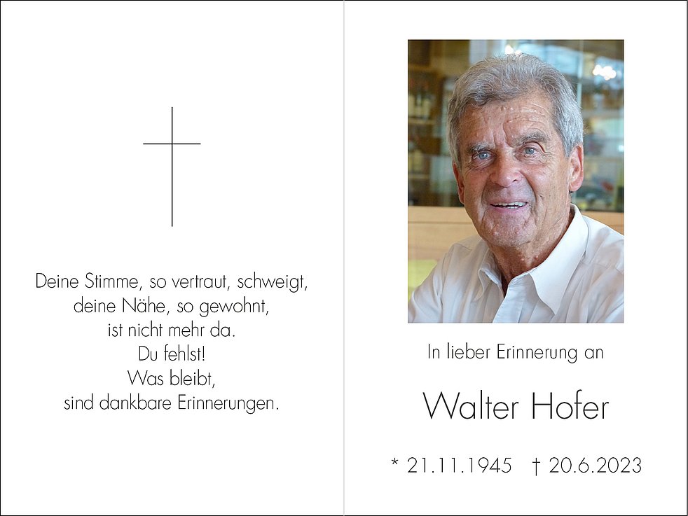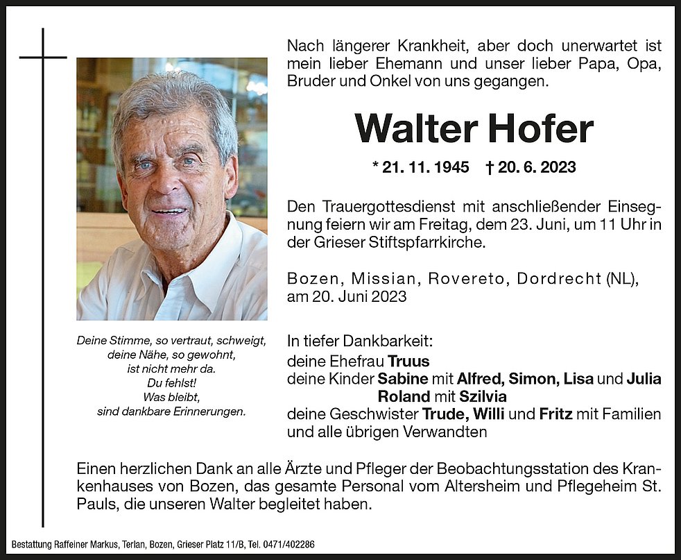 Einen herzlichen Dank an alle Ärzte und Pfleger der Beobachtungsstation des Krankenhauses von Bozen, das gesamte Personal vom Altersheim und Pflegeheim St. Pauls die unseren Walter begleitet haben.