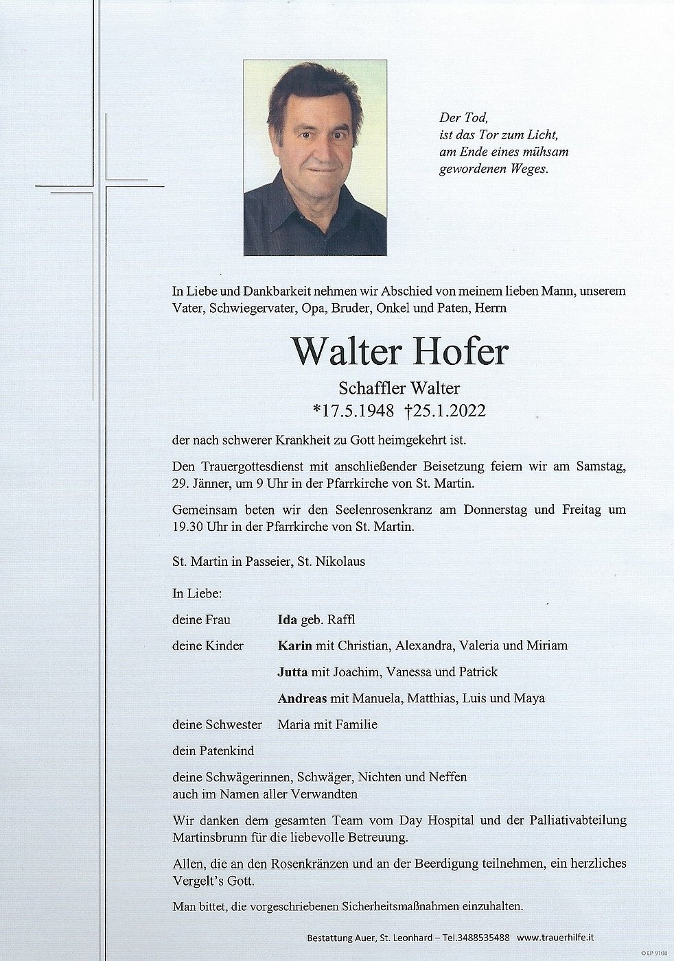 Den Trauergottesdienst mit anschließender Beisetzung feiern wir am Samstag, 29. Jänner, um 9 Uhr in der Pfarrkirche von St. Martin.