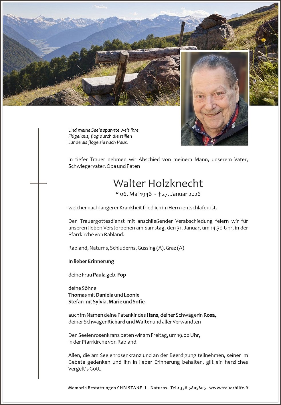 Den Trauergottesdienst mit anschließender Verabschiedung feiern wir für unseren lieben Verstorbenen am Samstag, den 31. Januar, um 14.30 Uhr, in der Pfarrkirche von Rabland.
