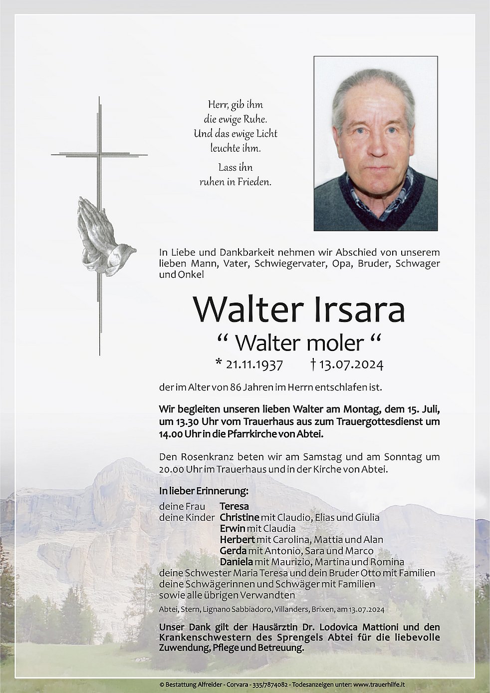 Begräbnisgottesdienst: 15.07. - 14:00 Uhr Pfarrkirche Abtei