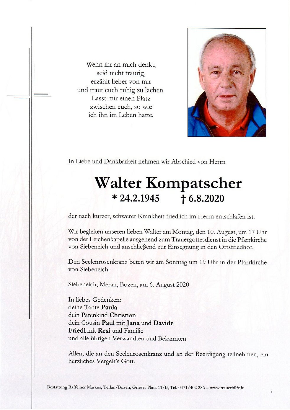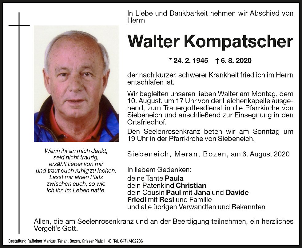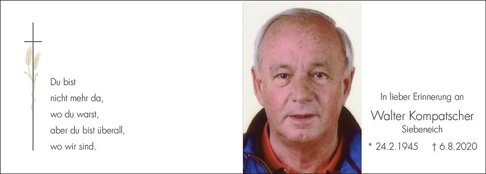 Wir begleiten unseren lieben Walter am Montag, dem 10. August, um 17 Uhr von der Leichenkapelle ausgehend zum Trauergottesdienst in die Pfarrkirche von Siebeneich und anschlieβend zur Einsegnung in den Ortsfriedhof.