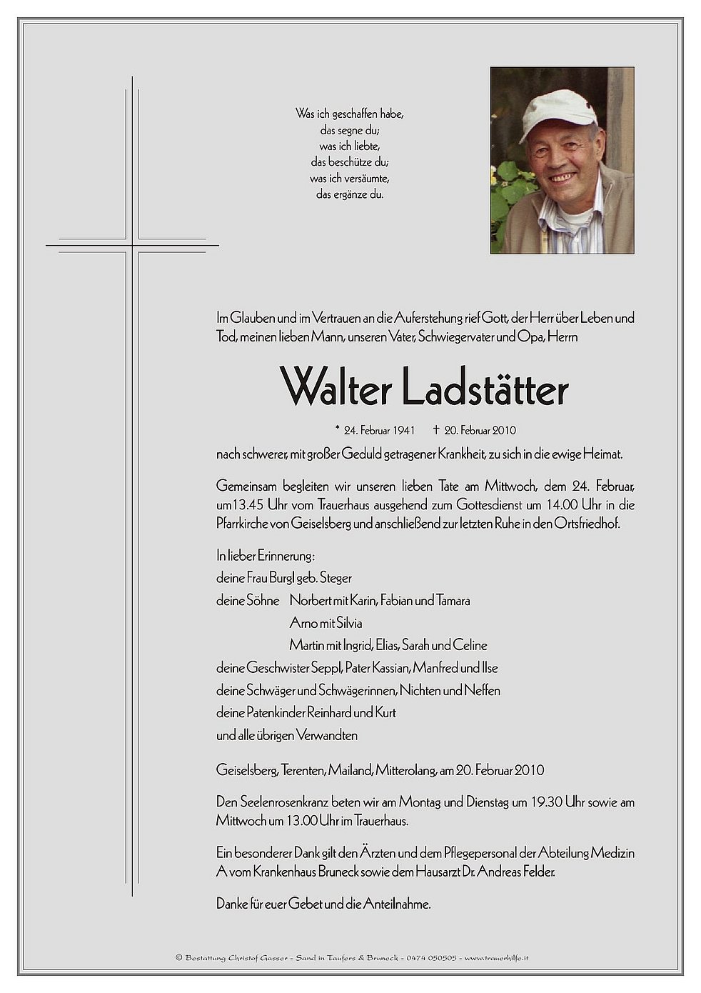 Gemeinsam begleiten wir unseren lieben Tate am Mittwoch, dem 24. Februar, um13.45 Uhr vom Trauerhaus ausgehend zum Gottesdienst um 14.00 Uhr in die Pfarrkirche von Geiselsberg und anschließend zur letzten Ruhe in den Ortsfriedhof.
