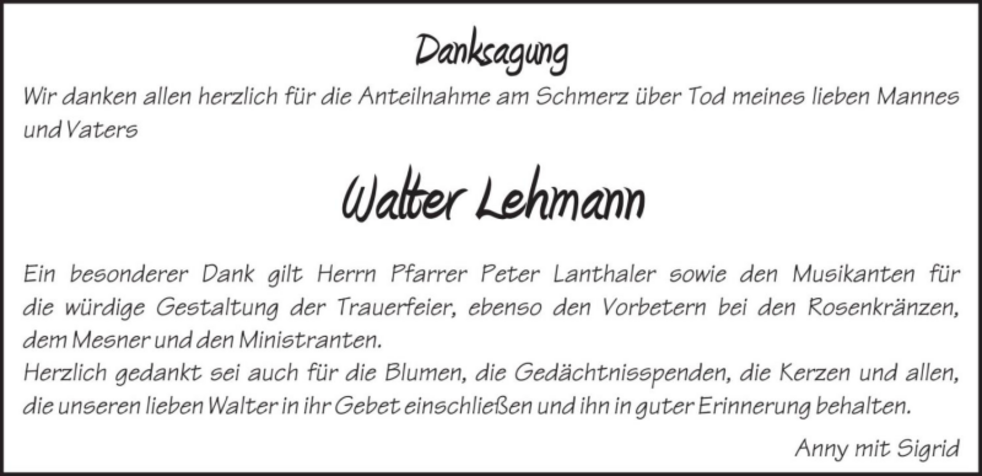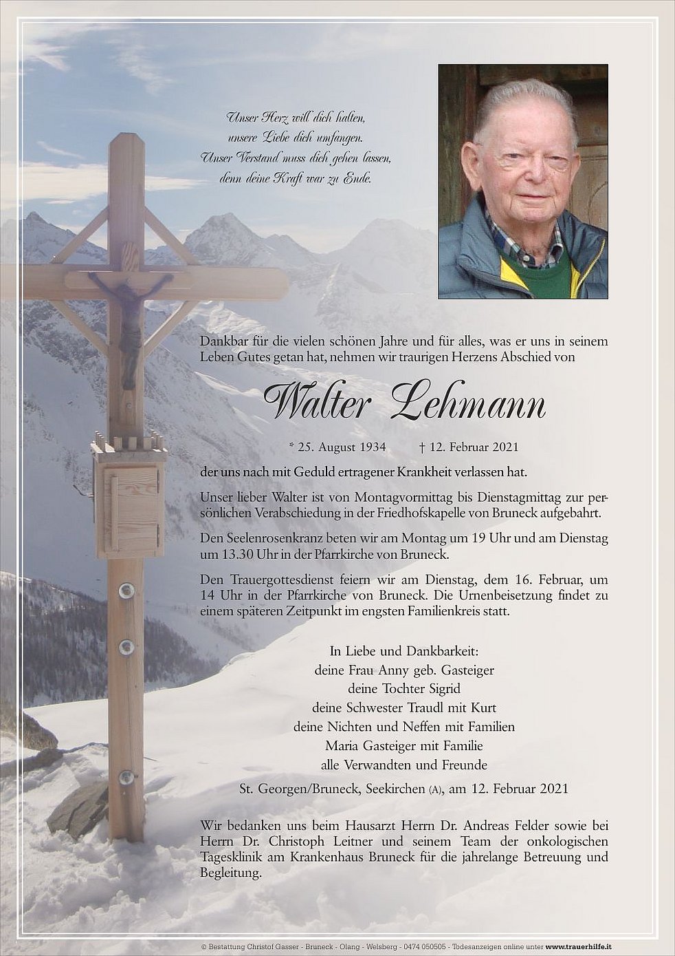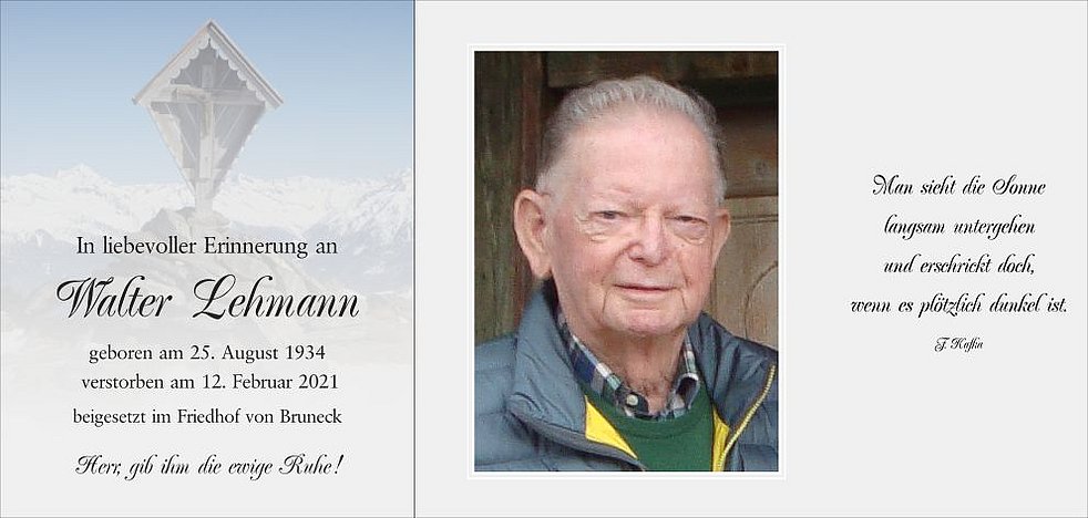 Den Trauergottesdienst feiern wir am Dienstag, dem 16. Februar, um 14 Uhr in der Pfarrkirche von Bruneck. Die Urnenbeisetzung findet zu einem späteren Zeitpunkt im engsten Familienkreis statt.