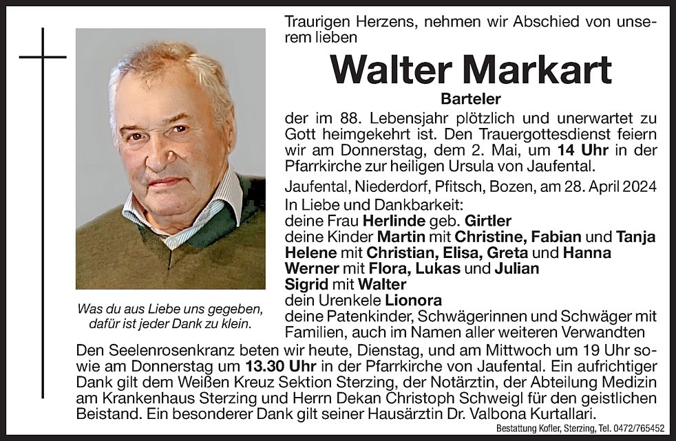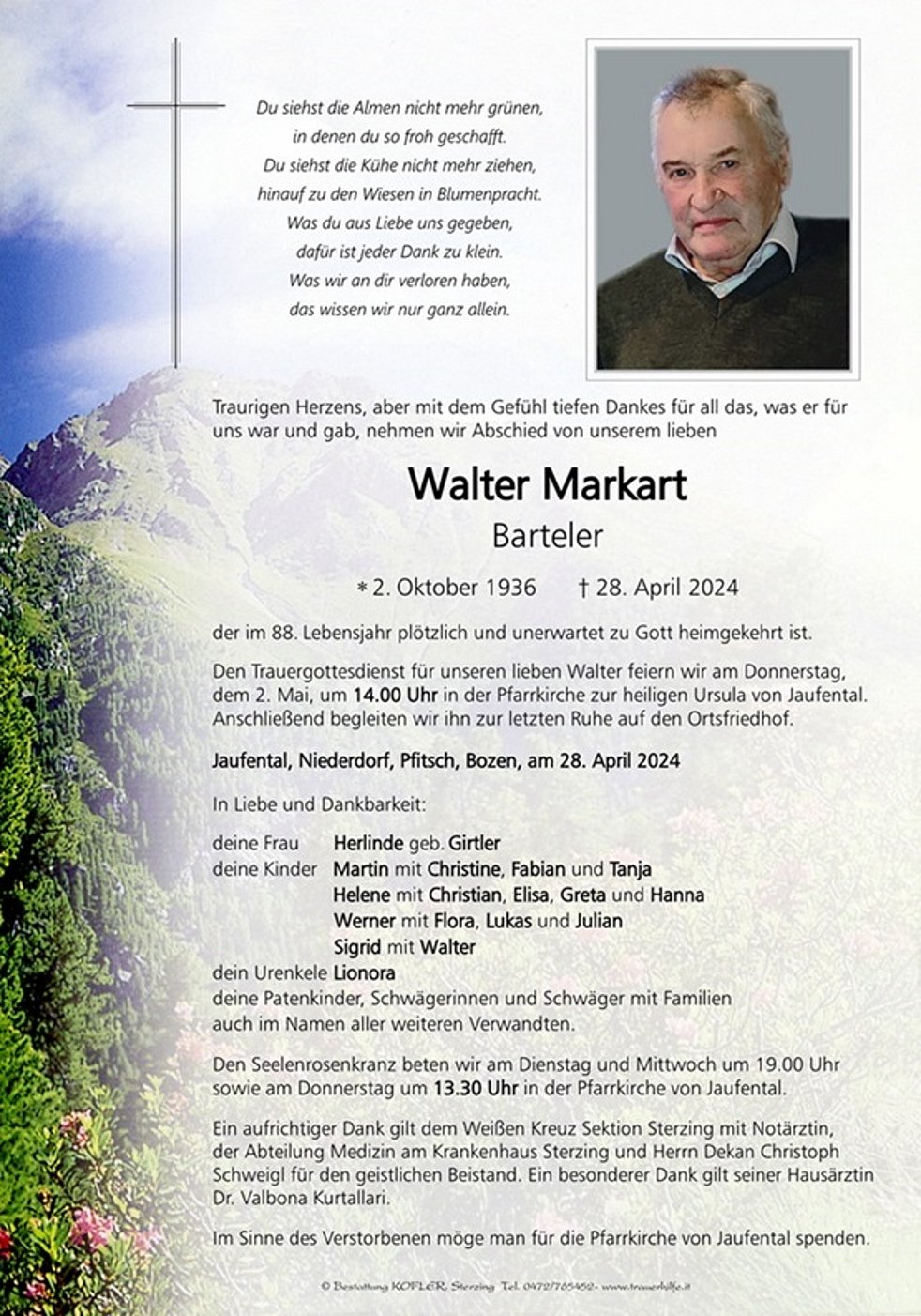 Den Trauergottesdienst für unseren lieben Walter feiern wir am Donnerstag, dem 2. Mai, um 14.00 Uhr in der Pfarrkirche zur heiligen Ursula von Jaufental. Anschließend begleiten wir ihn zur letzten Ruhe auf den Ortsfriedhof.