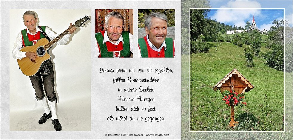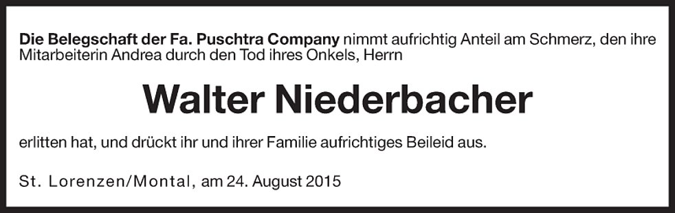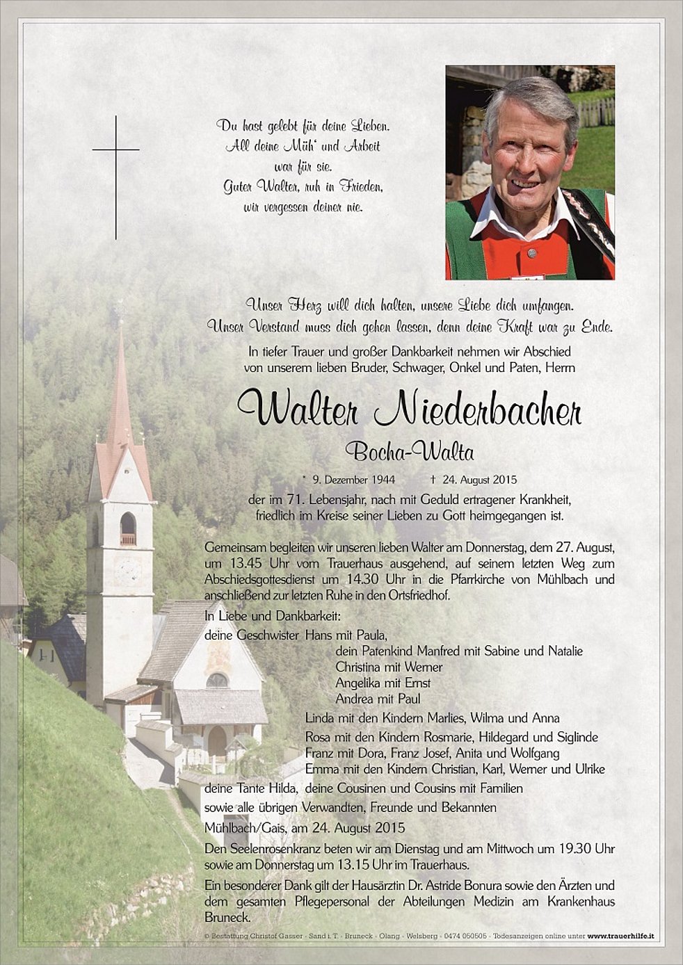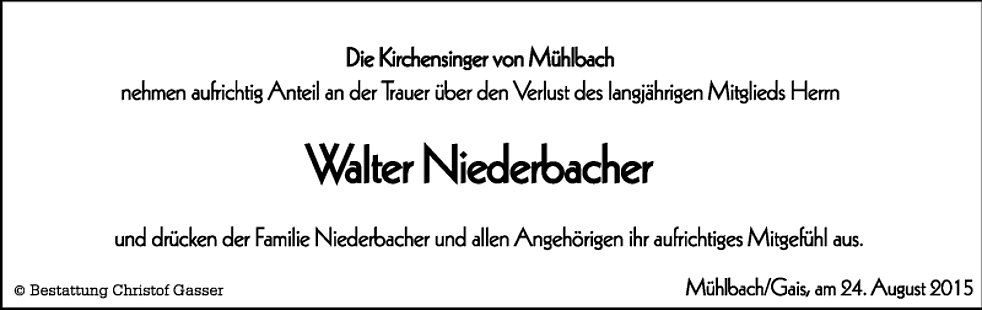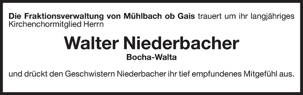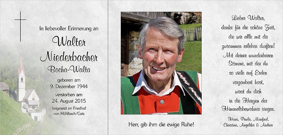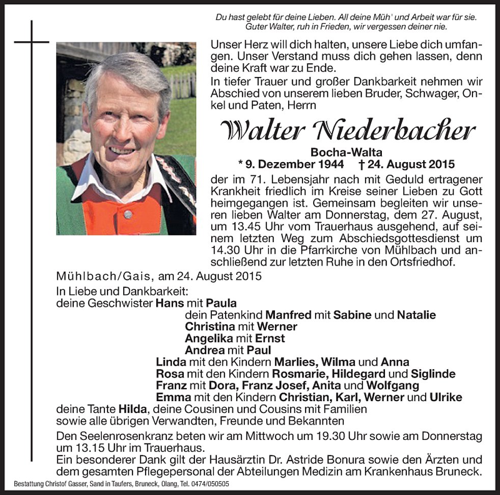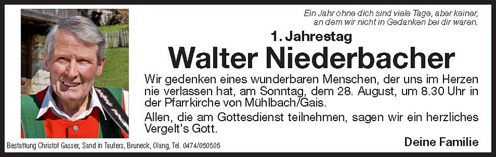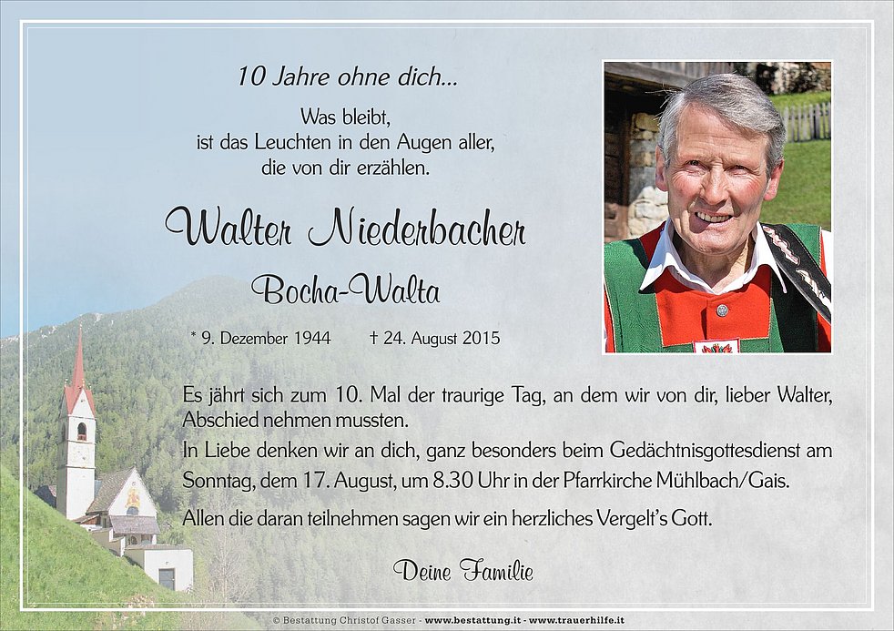 Gemeinsam begleiten wir unseren lieben Walter am Donnerstag, dem 27. August, um 13.45 Uhr vom Trauerhaus ausgehend, auf seinem letzten Weg zum Abschiedsgottesdienst um 14.30 Uhr in die Pfarrkirche von Mühlbach und anschließend zur letzten Ruhe in den Ortsfriedhof.