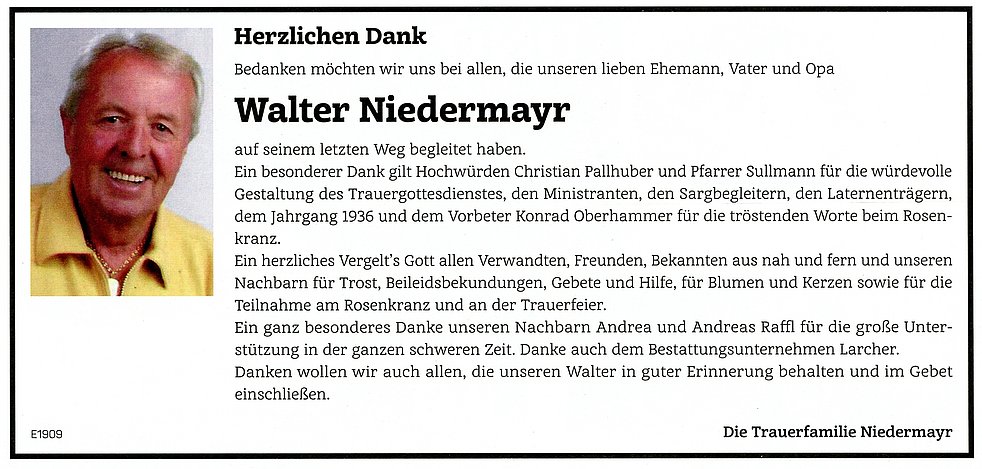Allen, die am Rosenkranz und an der Beerdigung teilnehmen, im Voraus ein herzliches Vergelt´s Gott.