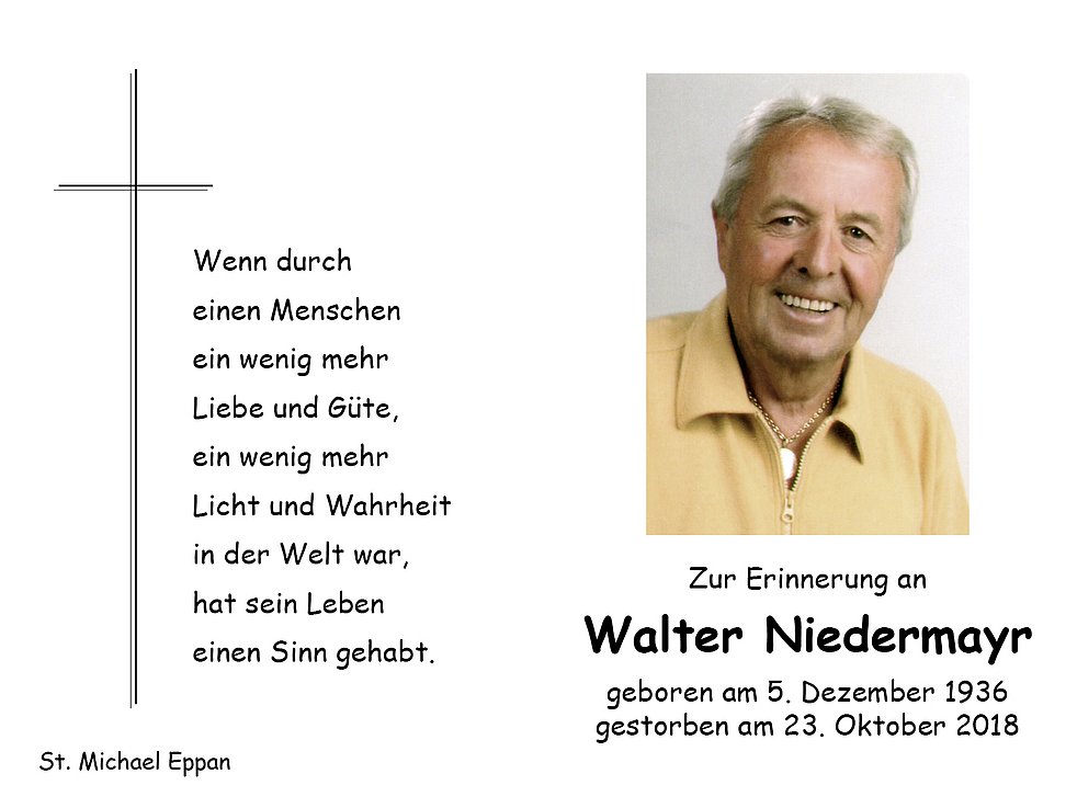 Den Abschiedsgottesdienst feiern wir am Samstag, dem 27. Oktober um 16.30 Uhr in der Pfarrkirche von St. Michael/Eppan. Anschließend begleiten wir unseren lieben Verstorbenen auf den Ortsfriedhof.