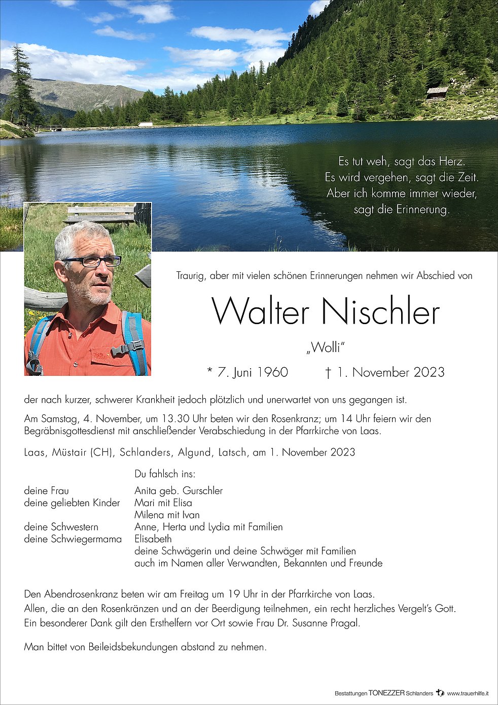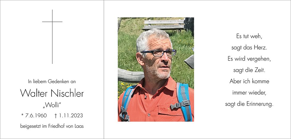 Am Samstag, 4. November, um 13.30 Uhr beten wir den Rosenkranz; um 14 Uhr feiern wir den Begräbnisgottesdienst mit anschließender Verabschiedung in der Pfarrkirche von Laas.