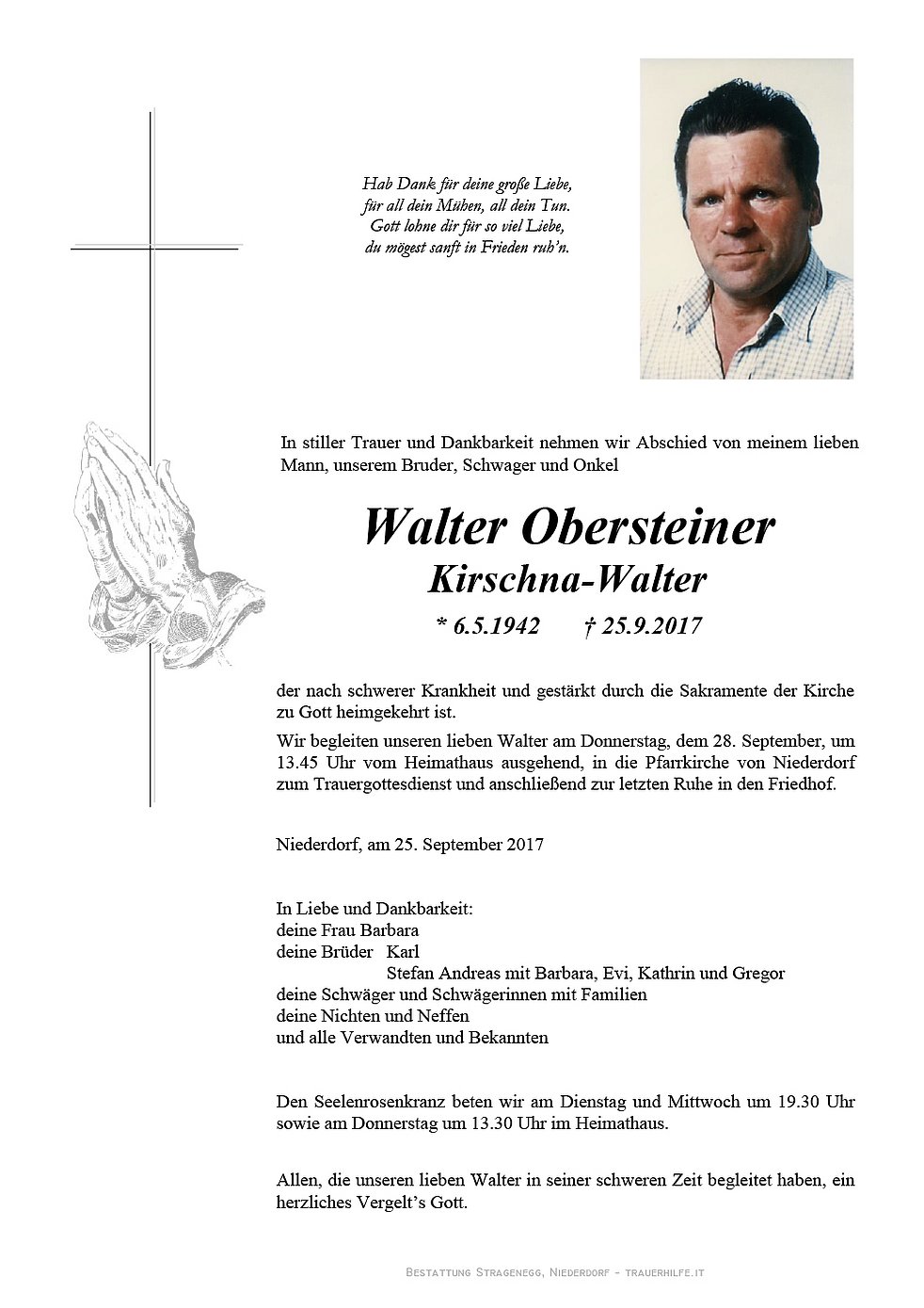 Wir begleiten unseren lieben Walter am Donnerstag, dem 28. September, um 13.45 Uhr vom Heimathaus ausgehend, in die Pfarrkirche von Niederdorf zum Trauergottesdienst und anschließend zur letzten Ruhe in den Friedhof.