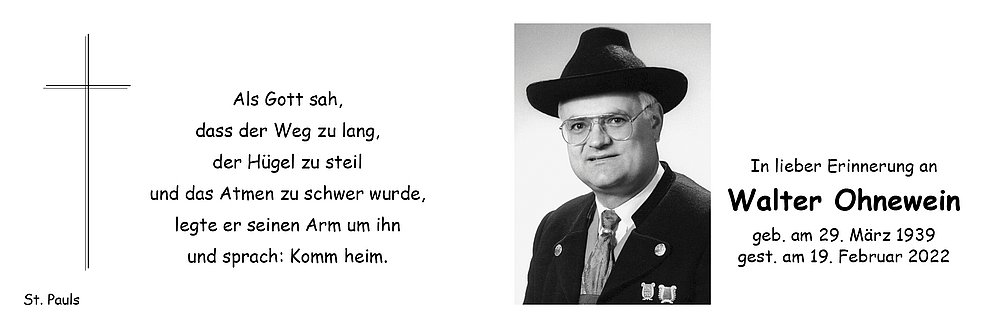 Den Trauergottesdienst feiern wir am Mittwoch, dem 23. Februar um 14.30 Uhr in der Pfarrkirche von St. Pauls. Anschließend begleiten wir unseren lieben Verstorbenen auf den Ortsfriedhof.