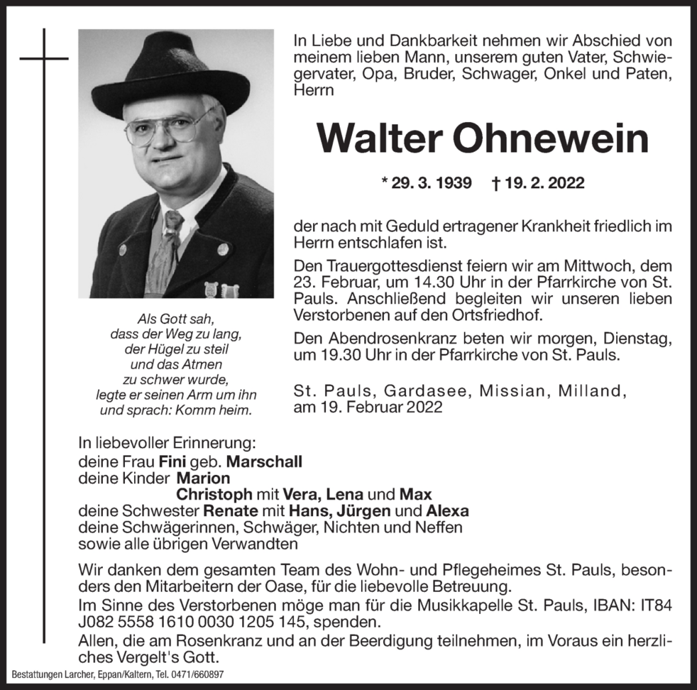 Im Sinne des Verstorbenen möge man für die Musikkapelle St. Pauls IBAN: IT84 J 08255 58161 000301205145 spenden.