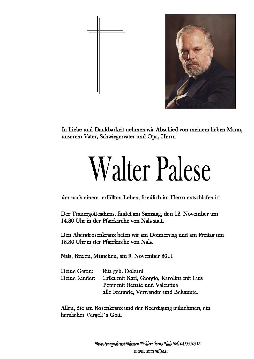 Der Trauergottesdienst findet am Samstag, den 12. November um