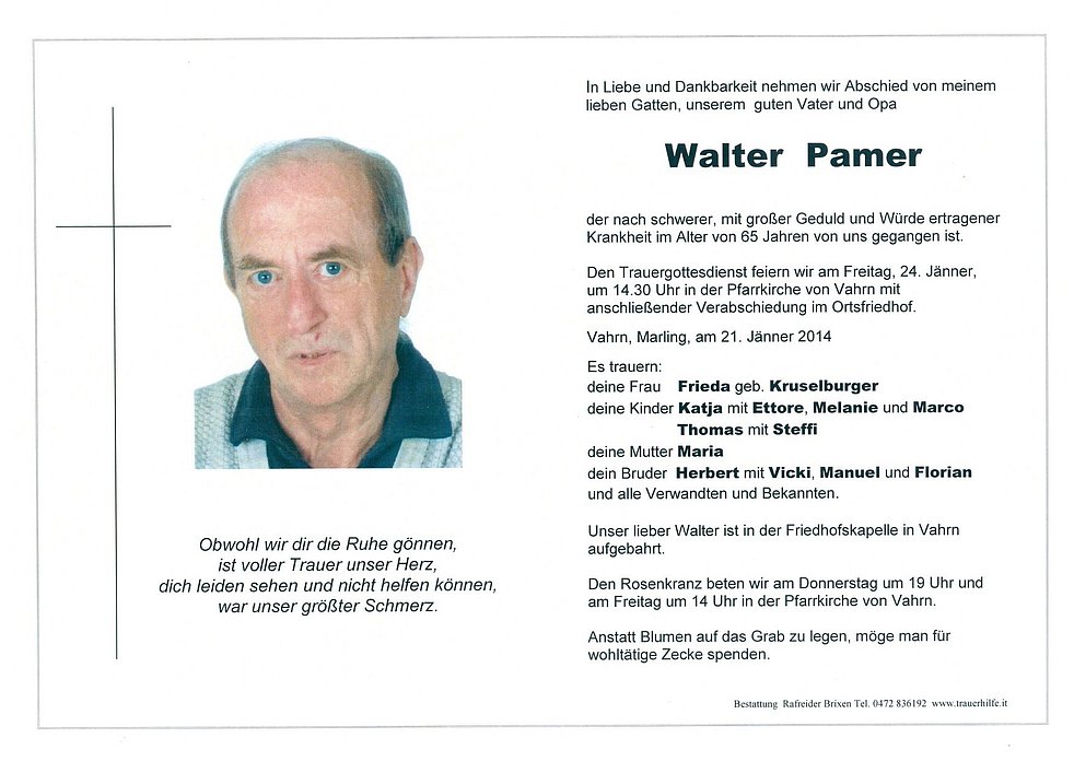 Den Trauergottesdienst feiern wir am Freitag, 24. Jänner, um 14.30 Uhr in der Pfarrkirche von Vahrn mit anschließender Verabschiedung im Ortsfriedhof.