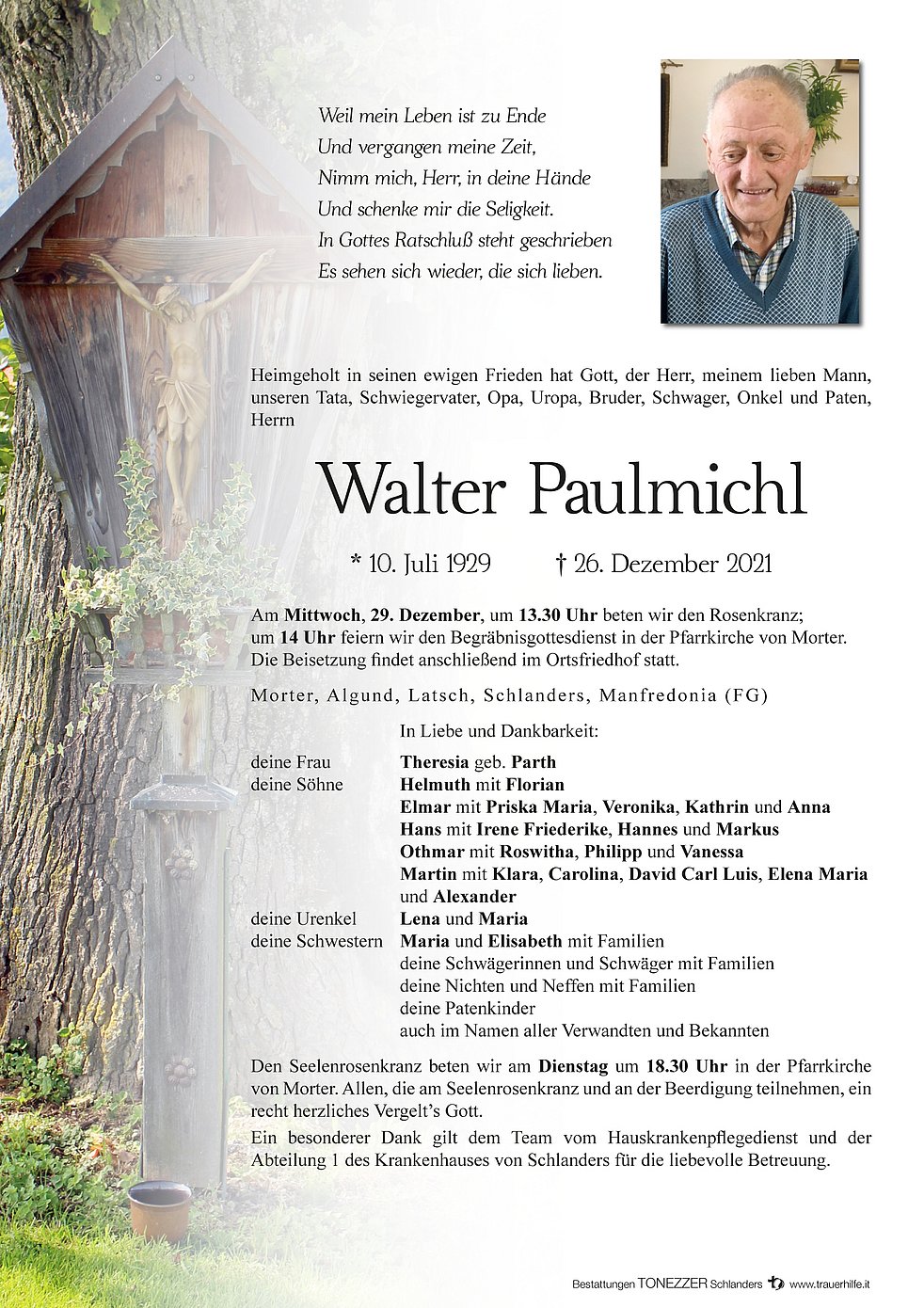 Am Mittwoch, 29. Dezember, um 13.30 Uhr beten wir den Rosenkranz; um 14 Uhr feiern wir den Begräbnisgottesdienst in der Pfarrkirche von Morter.