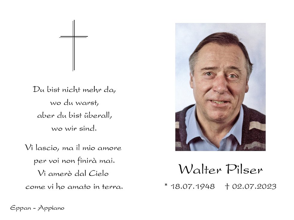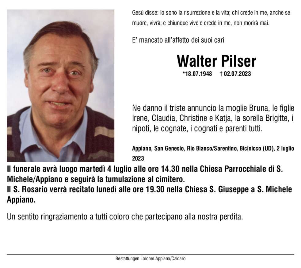 Ne danno il triste annuncio la moglie Bruna, le figlie Irene, Claudia, Christine e Katja, la sorella Brigitte, i nipoti, le cognate, i cognati e parenti tutti.