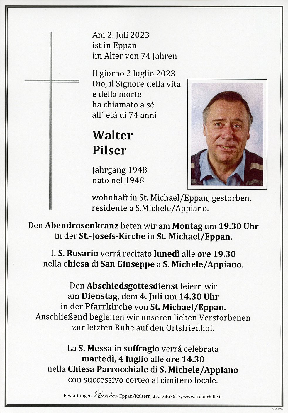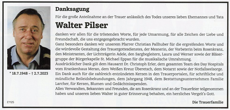Den Abschiedsgottesdienst feiern wir am Dienstag, den 4. Juli um 14.30 Uhr in der Pfarrkirche von St. Michael Eppan. Anschließend begleiten wir unseren lieben Verstorbenen zur letzten Ruhe auf den Ortsfriedhof.