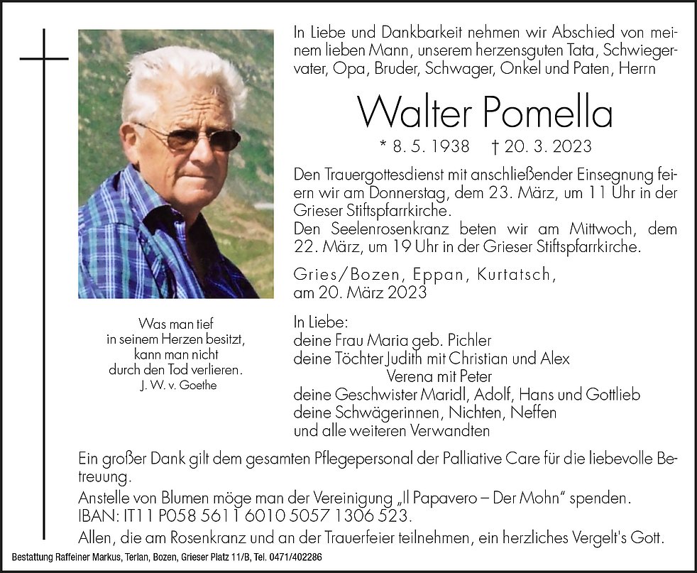 Anstelle von Blumen, möge man der Vereinigung „Il Papavero – Der Mohn“ spenden.