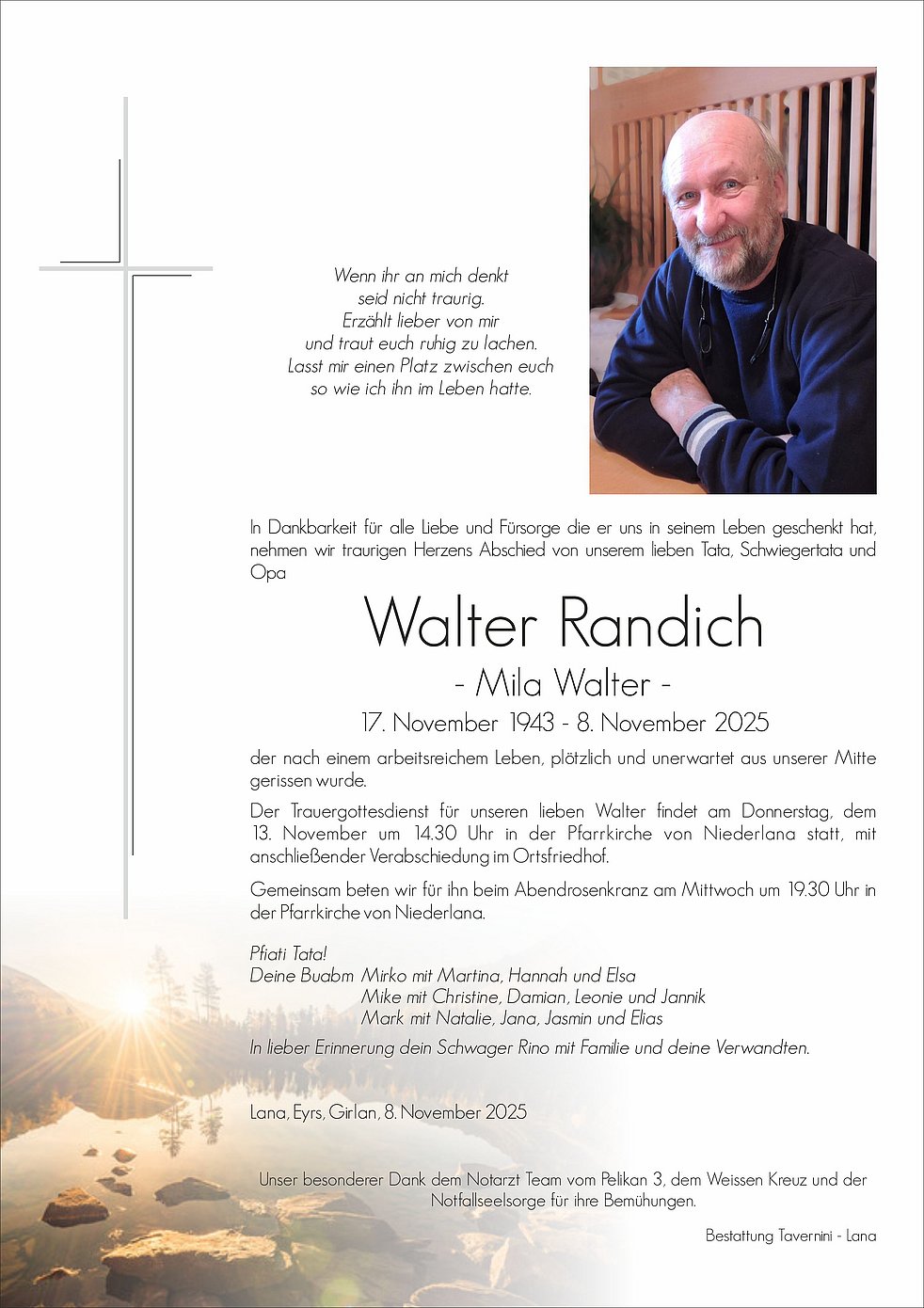 Liebe Familie Randich, lieber Mike, auf diesem Wege sende ich dir, und die Mitglieder des Vereins unser innigstes Beileid zum Ableben deines geliebten Vaters. Herr gib ihm die ewige Ruhe und das ewige Licht leuchte Ihm.