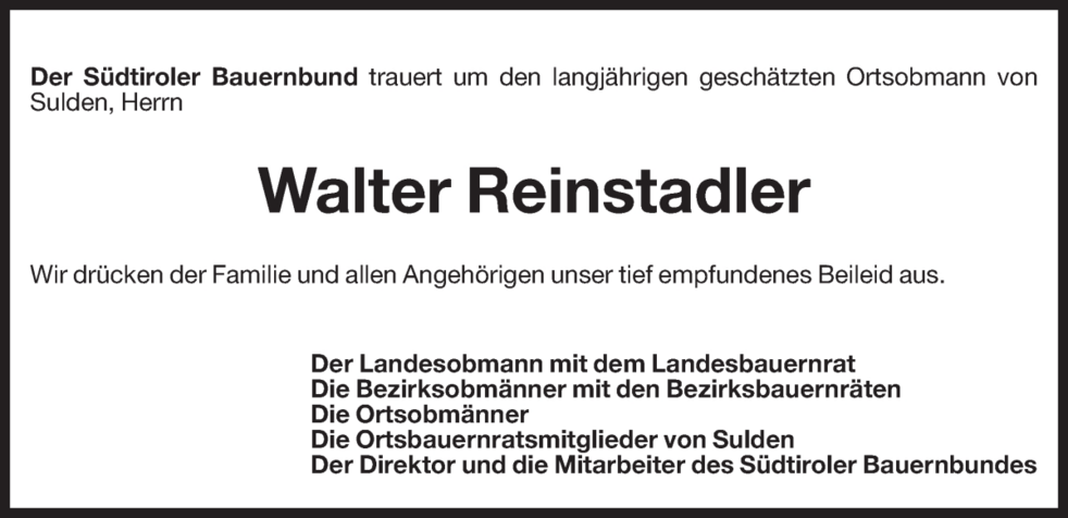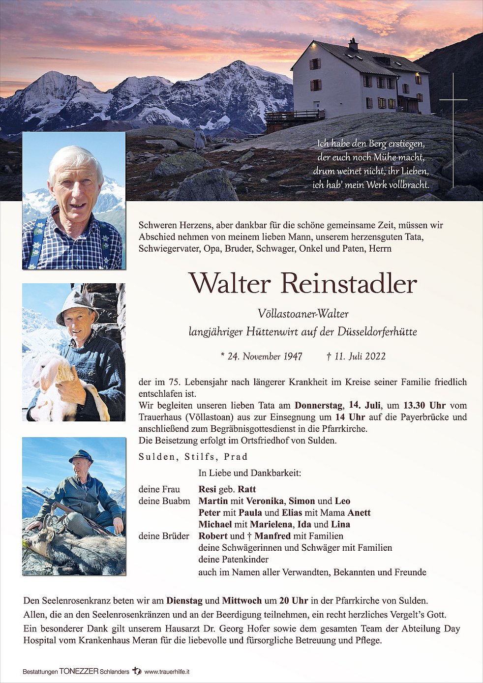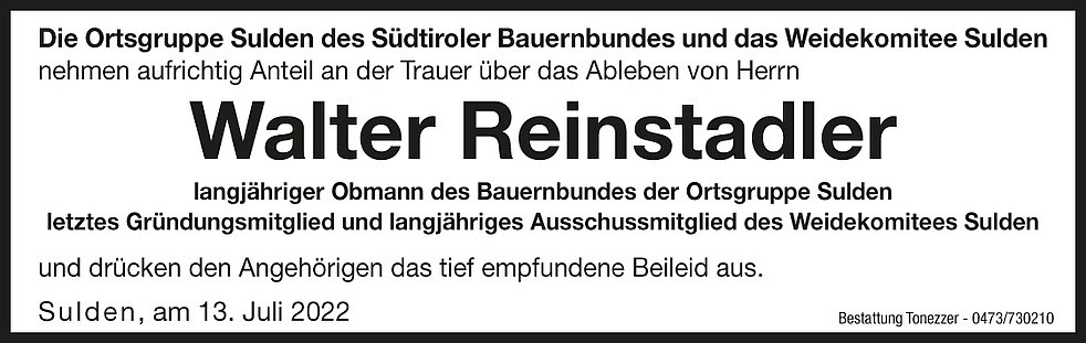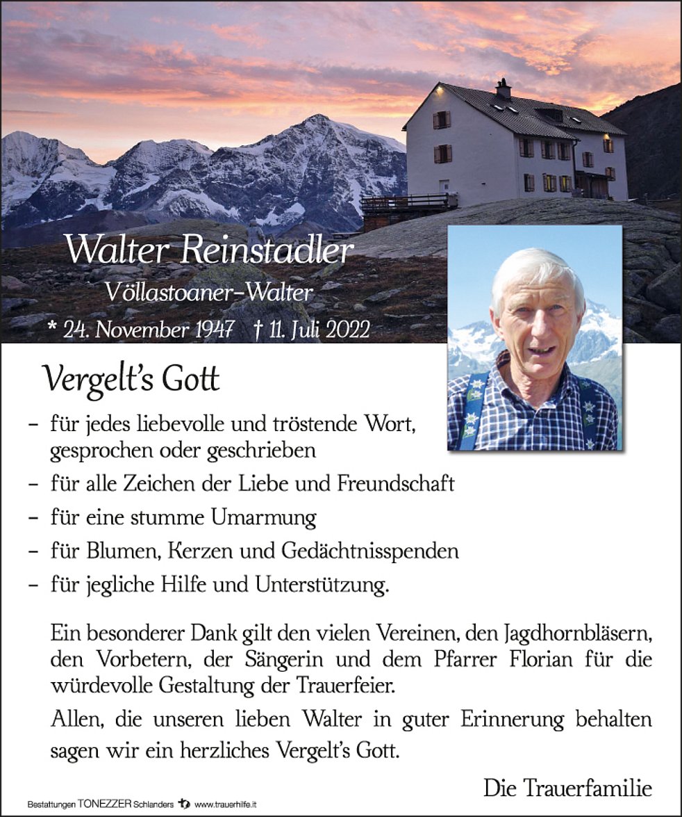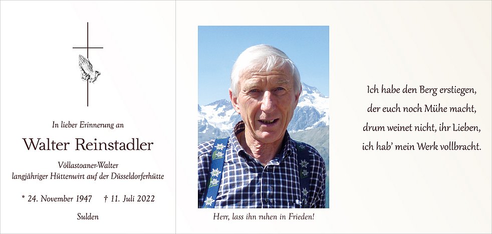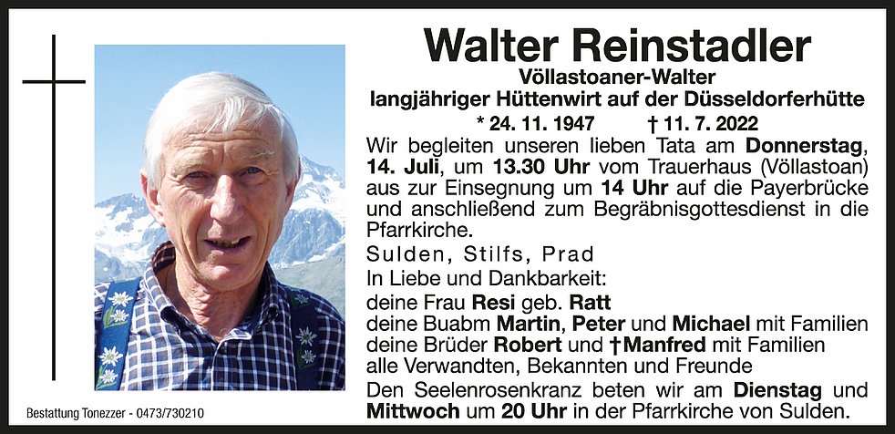 Wir begleiten unseren lieben Tata am Donnerstag, 14. Juli, um 13.30 Uhr vom Trauerhaus (Völlastoan) aus zur Einsegnung um 14 Uhr auf die Payerbrücke und anschließend zum Begräbnisgottesdienst in die Pfarrkirche.