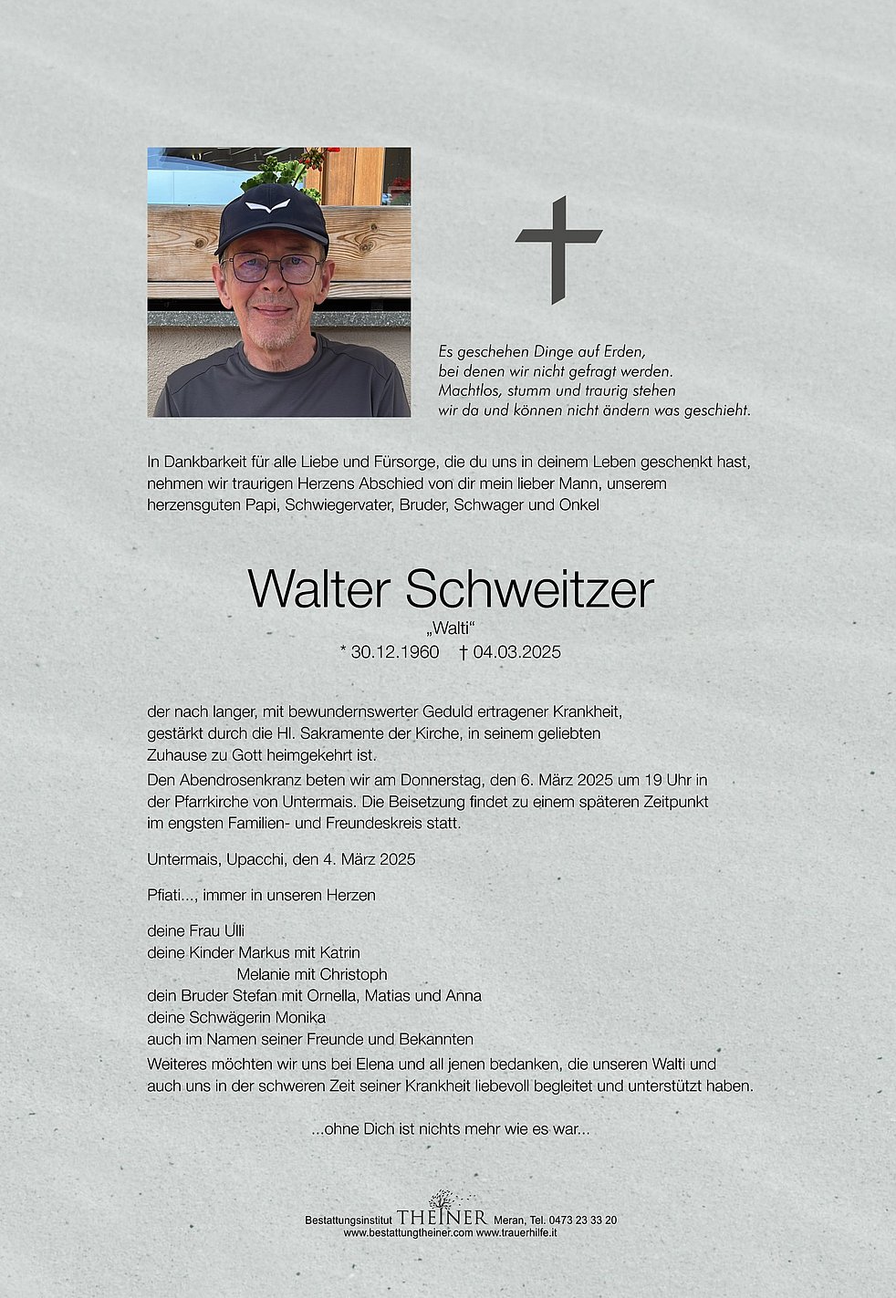 Den Abendrosenkranz beten wir am Donnerstag, den 6. März 2025 um 19 Uhr in der Pfarrkirche von Untermais. Die Beisetzung findet zu einem späteren Zeitpunkt im engsten Familien- und Freundeskreis statt.