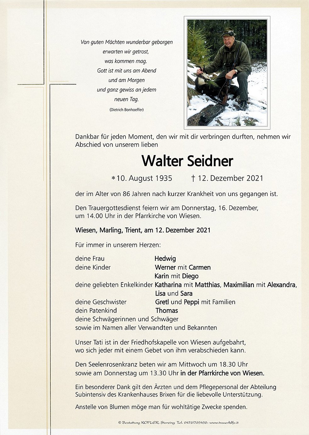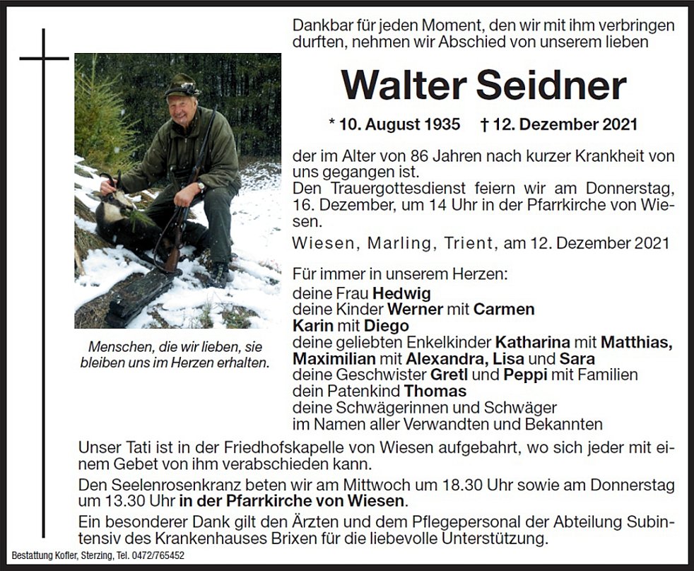 Den Trauergottesdienst feiern wir am Donnerstag, 16. Dezember, um 14.00 Uhr in der Pfarrkirche von Wiesen.