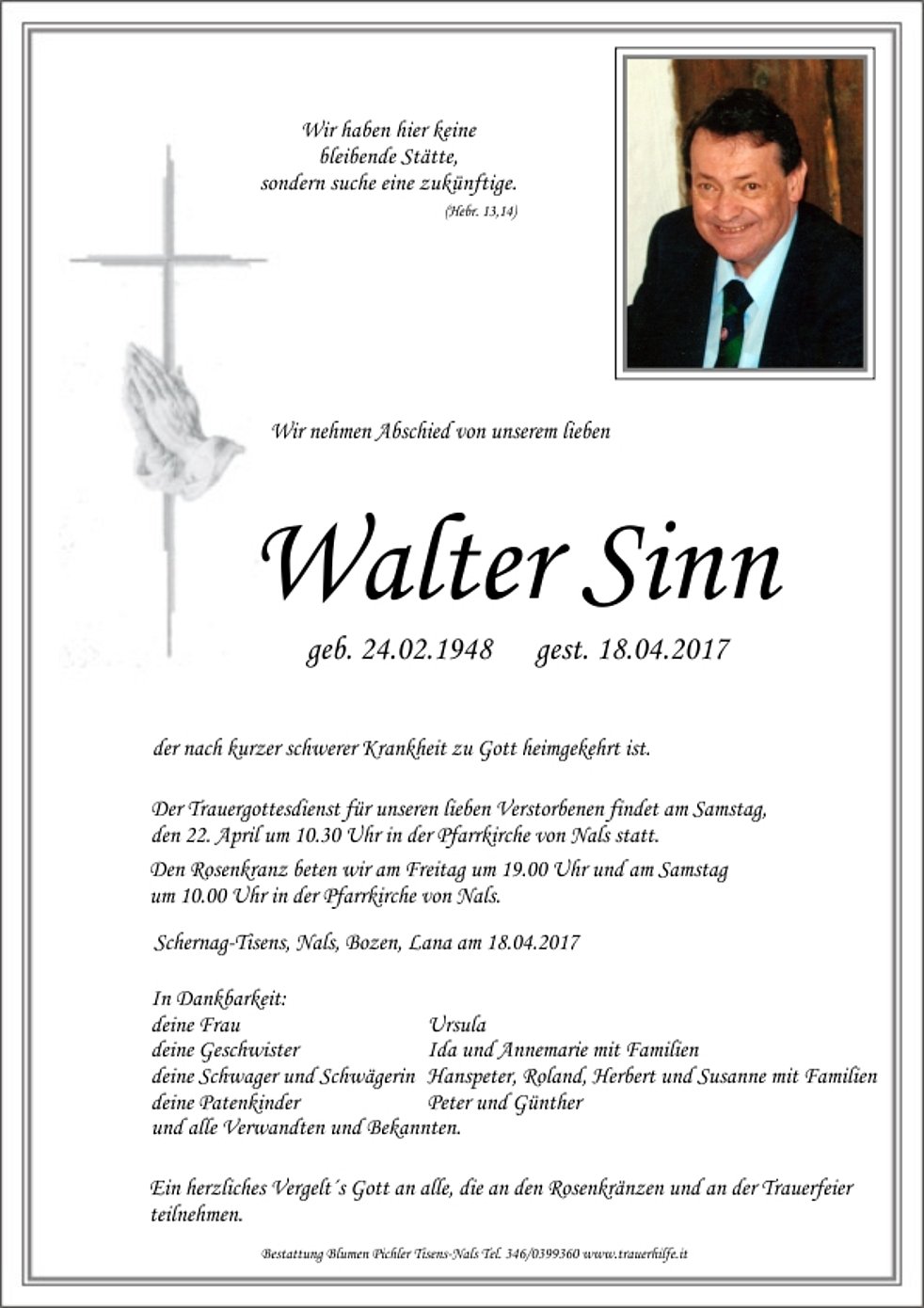 Der Trauergottesdienst für unseren lieben Verstorbenen findet am Samstag, den 22. April um 10.30 Uhr in der Pfarrkirche von Nals statt. Den Rosenkranz beten wir am Freitag um 19.00 Uhr und am Samstag