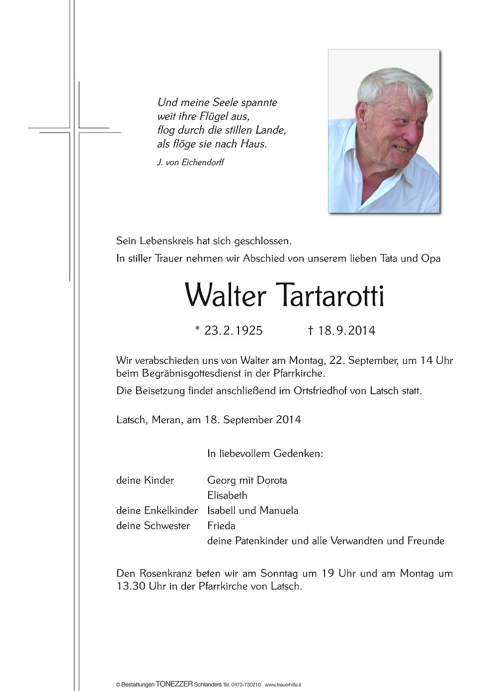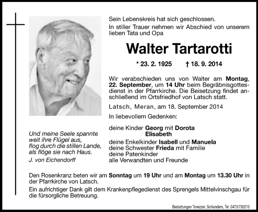 Wir verabschieden uns von Walter am Montag, 22. September, um 14 Uhr beim Begräbnisgottesdienst in der Pfarrkirche. Die Beisetzung findet anschließend im Ortsfriedhof von Latsch statt.