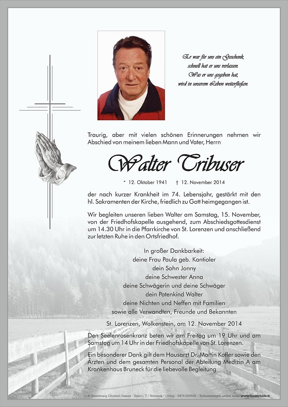 Wir begleiten unseren lieben Walter am Samstag, 15. November, von der Friedhofskapelle ausgehend, zum Abschiedsgottesdienst um 14.30 Uhr in die Pfarrkirche von St. Lorenzen und anschließend zur letzten Ruhe in den Ortsfriedhof.