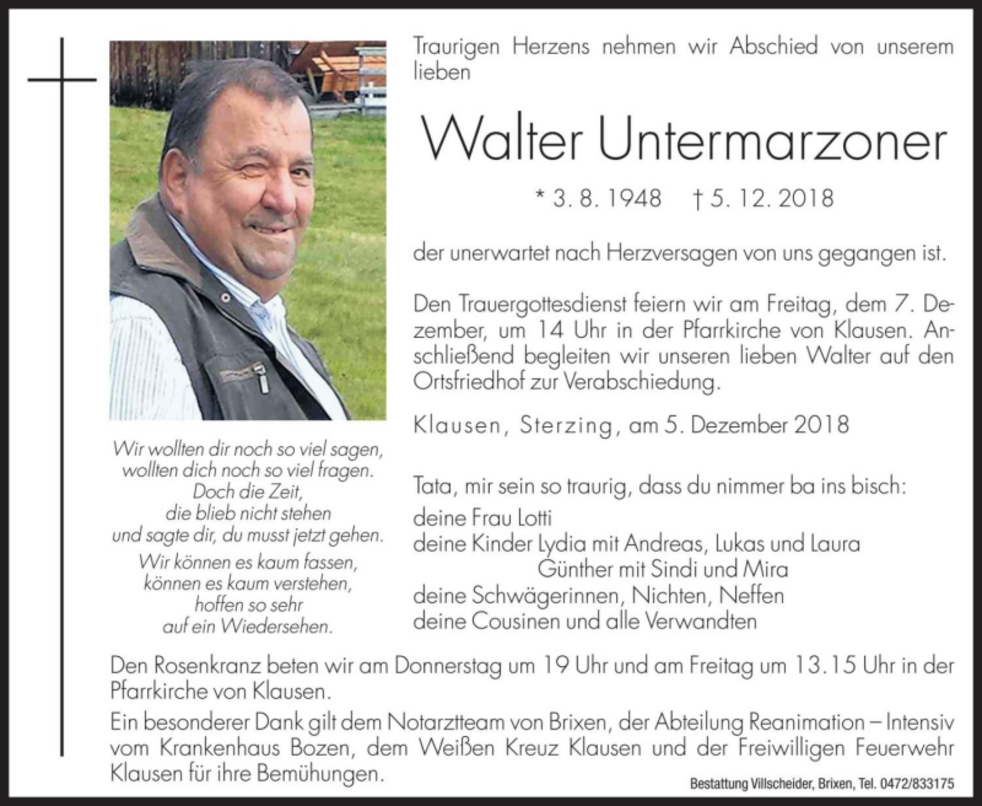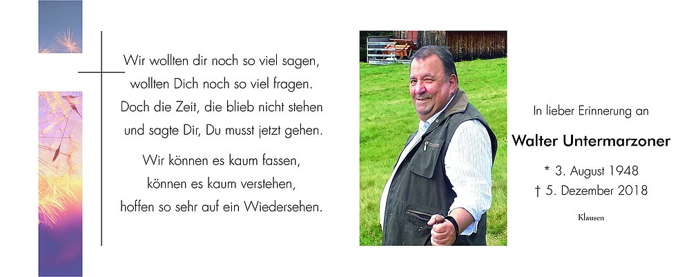 Lieber Walter, jetzt isch erst die nuie Krippe, dei du gemocht hosch, in der Klausner Pforrkirche eingeweiht worden. I woaß, des hot di voll gfreit. Und iatz hosch di so plötzlich verobschiedet. So viele Krippen hobm mir mit dir mochn geterft, alle sein se wunderbor geworden. Du wersch in viele Leit fahln. Ruhe in Frieden und schaug auf ins oar. An aufrichtiges Beileid an die Lotte und in di Kinder.