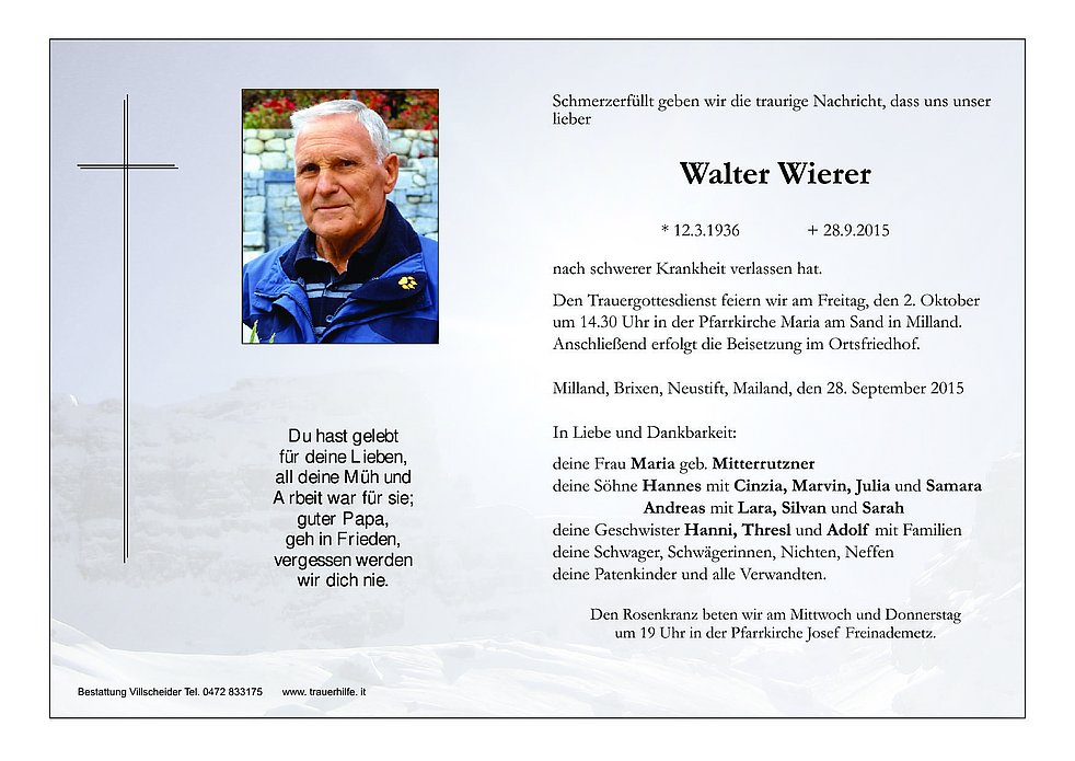 Den Trauergottesdienst feiern wir am Freitag, den 2. Oktober