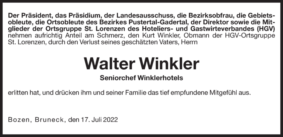 Vor 50 Jahren hast du mit dem Hotel Lanerhof den Grundstein gelegt, für eine außergewöhnliche Entwicklung der Winklerhotels. In den folgenden Jahren hast du mit viel Fleiß, Freude und Weitblick ganz Besonderes geschaffen. Dein Wesen war geprägt von einem großen Gerechtigkeitssinn, besonderer Großzügigkeit und Lebensfreude. Deinen positiven Blick auf das Leben hast du trotz deiner Krankheit nie verloren. Du wirst fehlen.