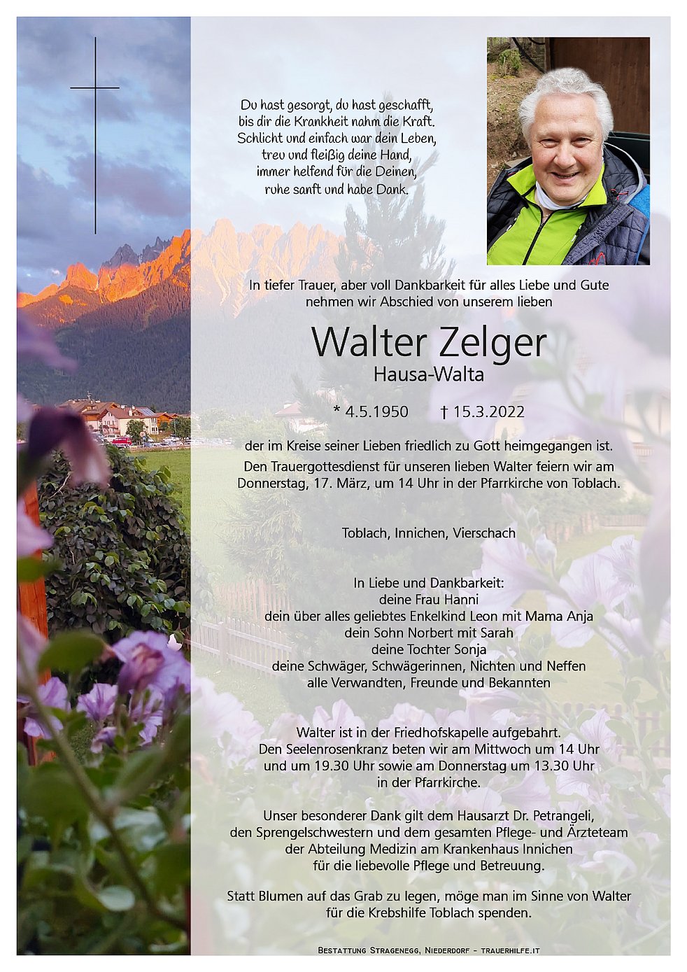 Statt Blumen auf das Grab zu legen, möge man im Sinne von Walter für die Krebshilfe Toblach spenden.